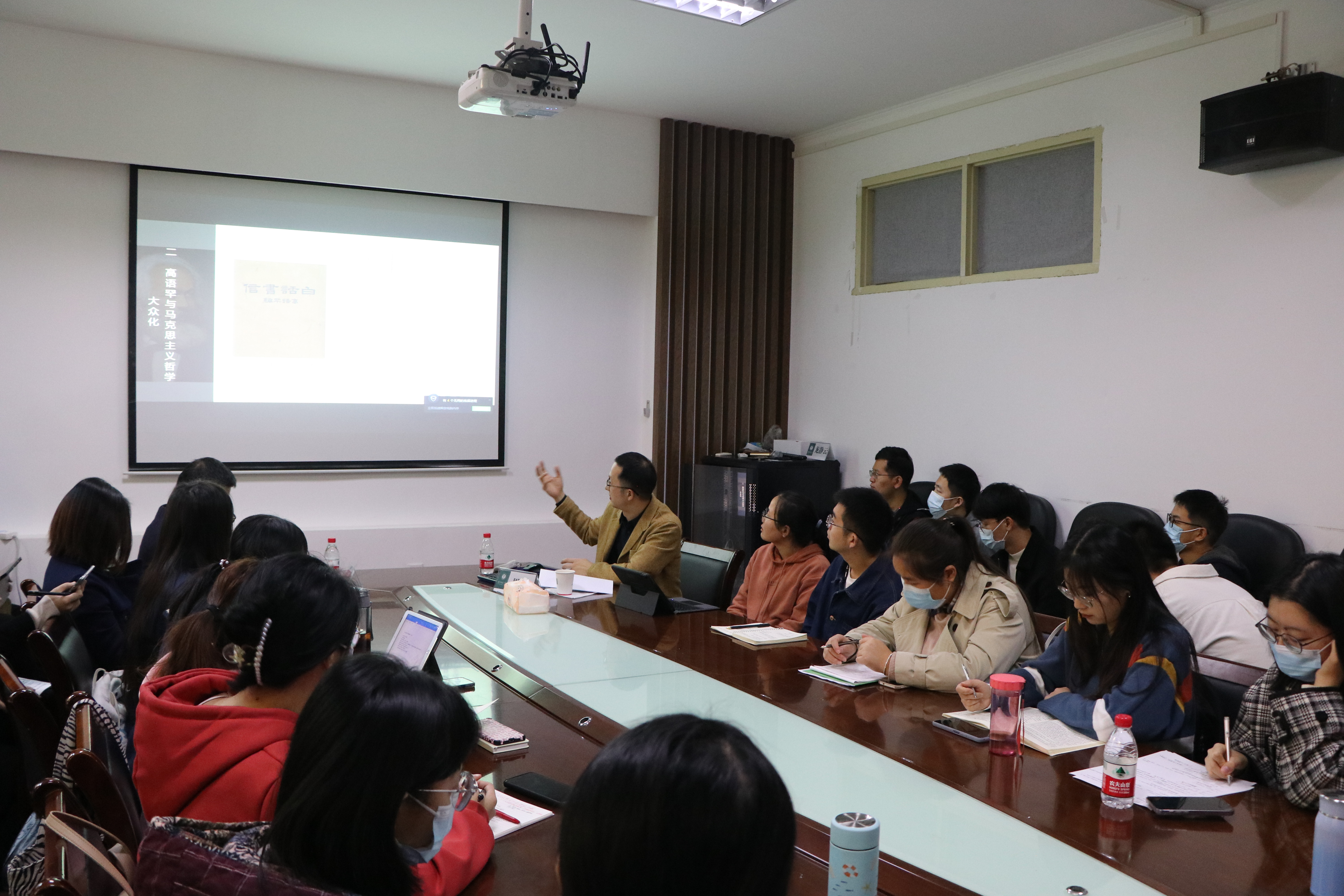 马克思主义学院讯(通讯员 杨柯鑫;摄影 殷淑霞 )2021年11月15日上午九点到十一点三十分,由华中师范大学“马克思主义生态文明及其中国化研究”青年学术创新团队和华中师范大学马克思主义学院马克思主义与人类文明研究中心主办、马克思主义学院研究生会承办的以“重估《大众哲学》的理论贡献”为主题学术讲座在1号教学楼二楼会议室顺利举办。本次讲座应邀到武汉大学哲学学院副教授周可主讲,华中师范大学马克思主义学院副教授戴圣鹏担任主持。马克思主义学院哲学专业的部分教师及博硕士研究生参加了本次讲座。