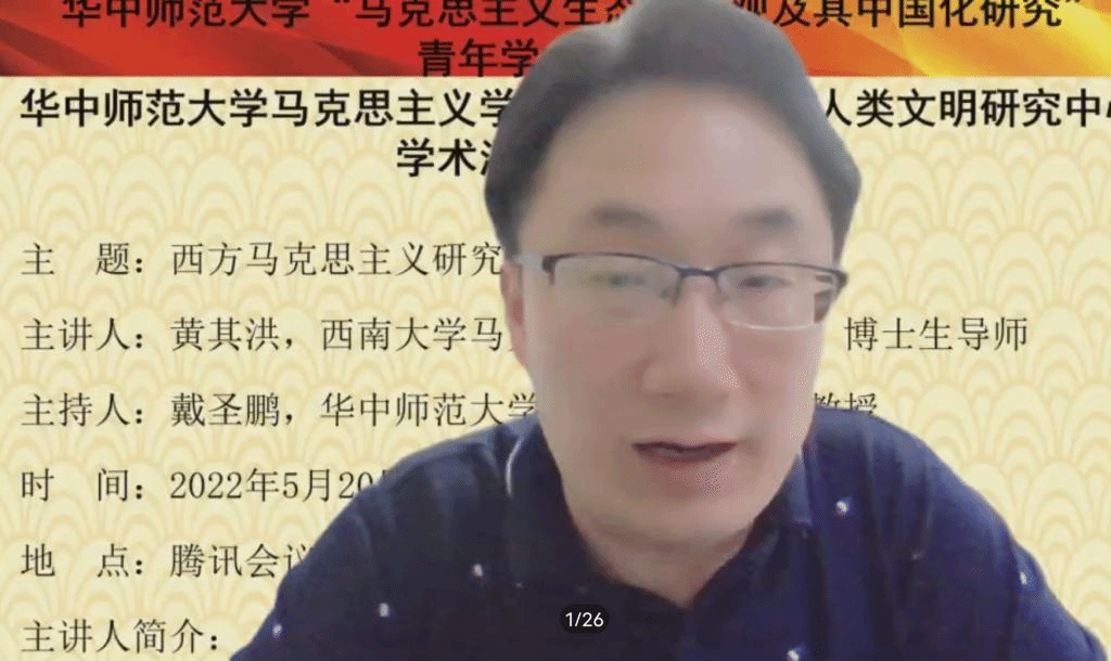 马克思主义学院讯(通讯员 杨柯鑫)5月20日晚上,由华中师范大学“马克思主义生态文明及其中国化研究”青年学术创新团队和华中师范大学马克思主义与人类文明研究中心主办的以“西方马克思主义研究的方法论问题”为主题的学术讲座在腾讯会议顺利举行。本次讲座特邀黄其洪教授担任主讲人,华中师范大学马克思主义学院戴圣鹏副教授担任主持人,我院部分教师及硕博研究生近200人参加了本次讲座。