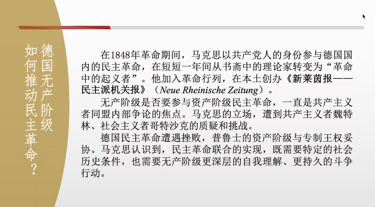 在这一模块,韩蒙老师首先讲述了法国无产阶级如何摆脱观念的束缚,他表示:“社会主义”主张已成为以社会主义形势表达资产阶级利益;其次对于无产阶级如何在革命低谷期间展望未来,韩蒙老师表示:“作为工商业繁荣的一个政治后果,无产阶级的革命意愿和阶级意识,与他们的生活经验和日常意识之间的反差也成为一个不得不面对的问题。”;此外关于引领无产阶级群众的“真正革命的党”,韩蒙老师表示:“马克思的《法兰西阶级斗争》给予人很大的启发,讲述了如何引领无产阶级群众在社会革命中摆脱观念意识的空想、掌握历史进程的主动。”