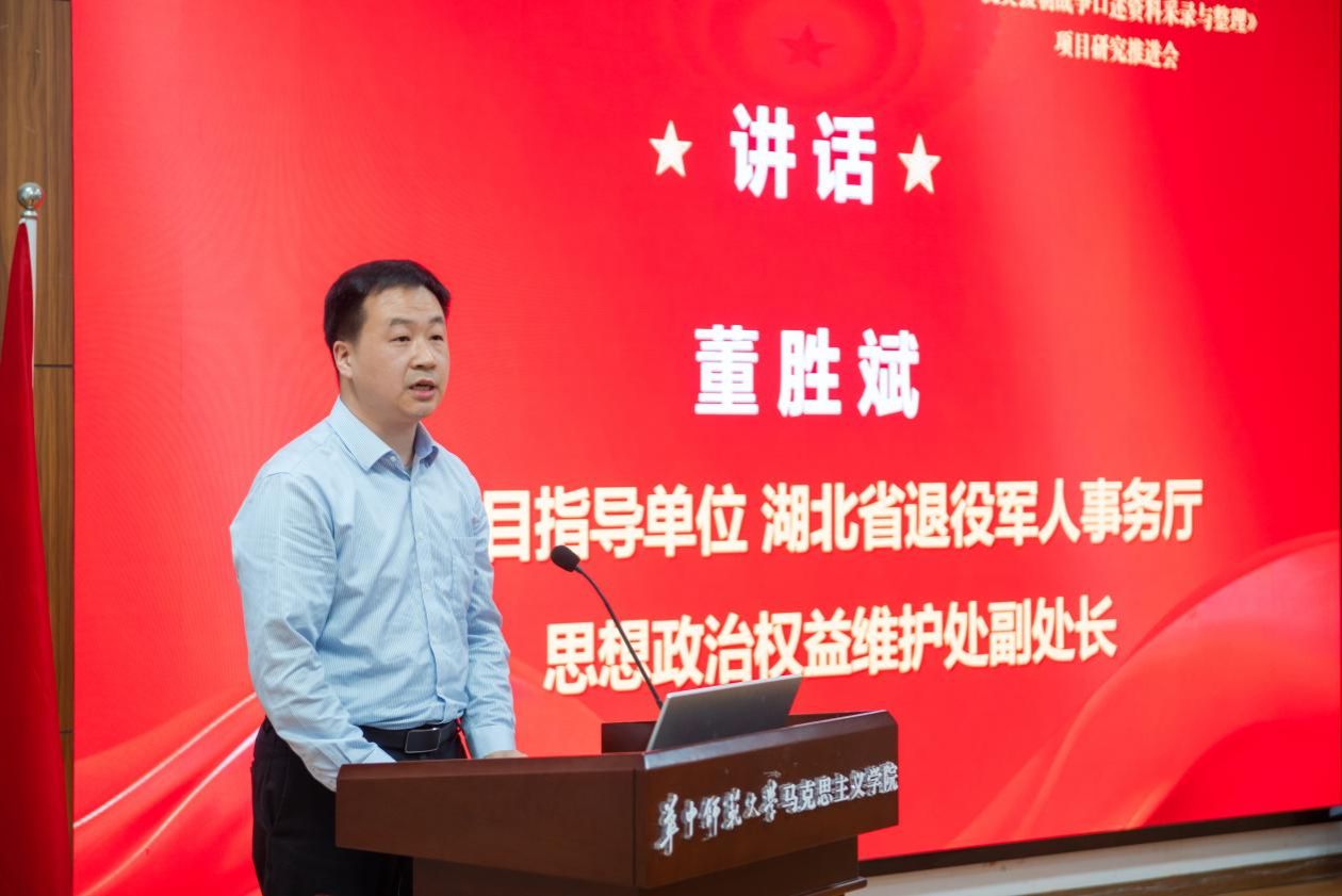 项目指导单位、湖北省退役军人事务厅思想政治权益维护处副处长董胜斌讲话。他对参与此项工作的师生的辛勤奉献表示了衷心的感谢,并指出在此后工作中要接续奋斗,继续以敬畏之心对待采访对象,注重采访的语言表达,秉持“您说我记”的理念,做到细心倾听,耐心记录,让采访对象感受到尊重关怀。此外,他提出真实记录的工作要求,强调工作成果要经得起历史的检验,坚持以传承为本,丰富红色文化,推进红色文化进校园,加强校园精神洗礼。在对接工作方面,他表示湖北省退伍军人事务厅将积极进行信息沟通,妥善推进采录工作,做好成果转化。最后,他明确抗美援朝战争资料的收录是多方的共同责任,呼吁全体成员坚定地推行此项工作。
