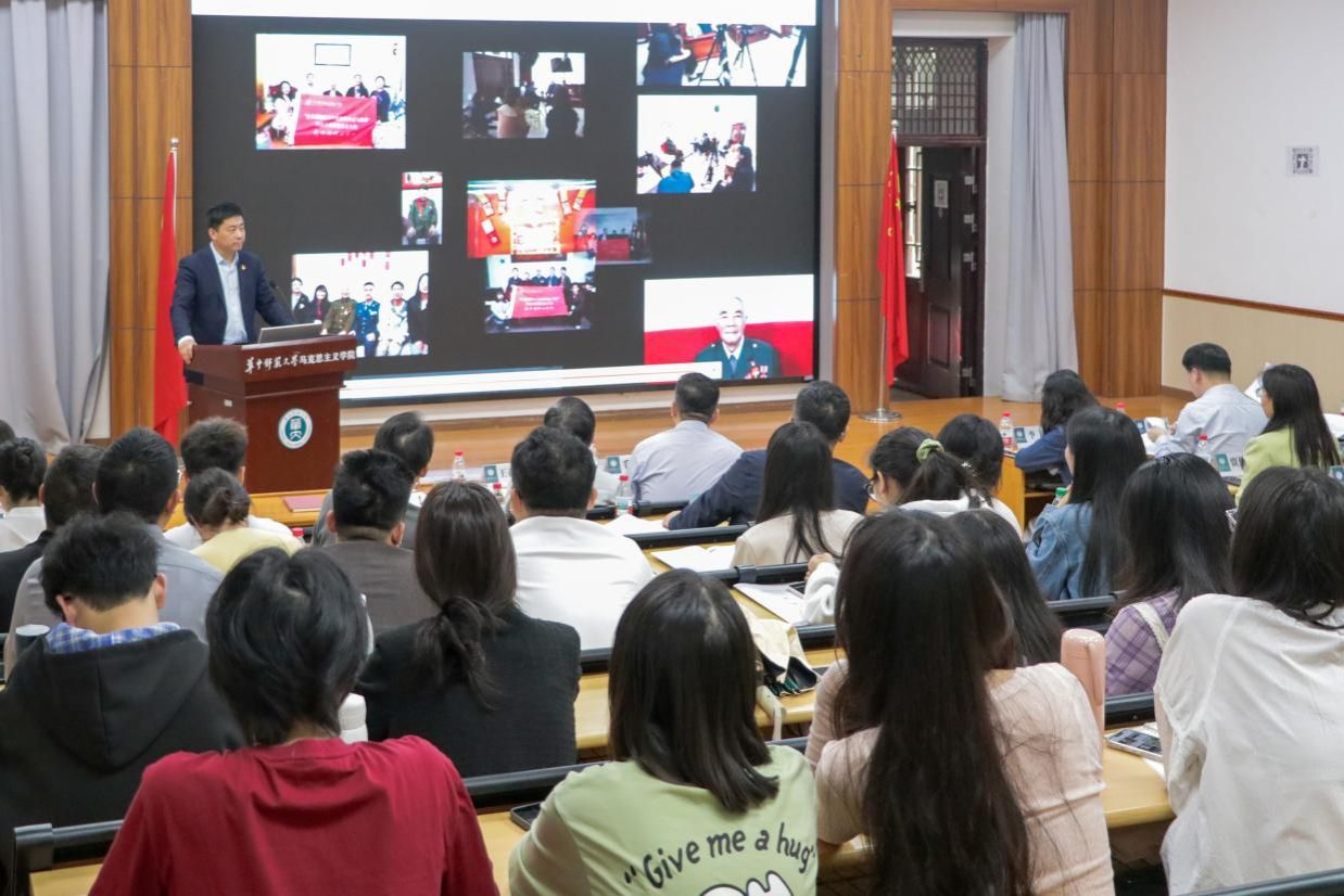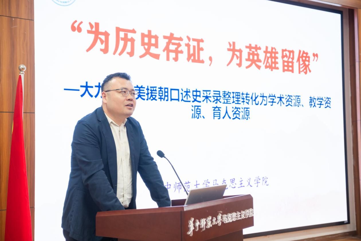 项目子课题负责人、华中师范大学马克思主义学院吕惠东副教授作《“为历史存证,为英雄留像”——大力将抗美援朝口述史采录整理转化为学术资源、教学资源、育人资源》主旨发言。他讲述了自己爷爷的抗美援朝战争经历,表达了自己投入此项研究的切实体会,分享了团队成员在长期采录工作的成效,在此基础上,着重强调要将此项工作转化为深化研究的学术资源、教书育人的教学资源、自信自强的育人资源,弘扬伟大抗美援朝精神,走好新时代的长征路。
