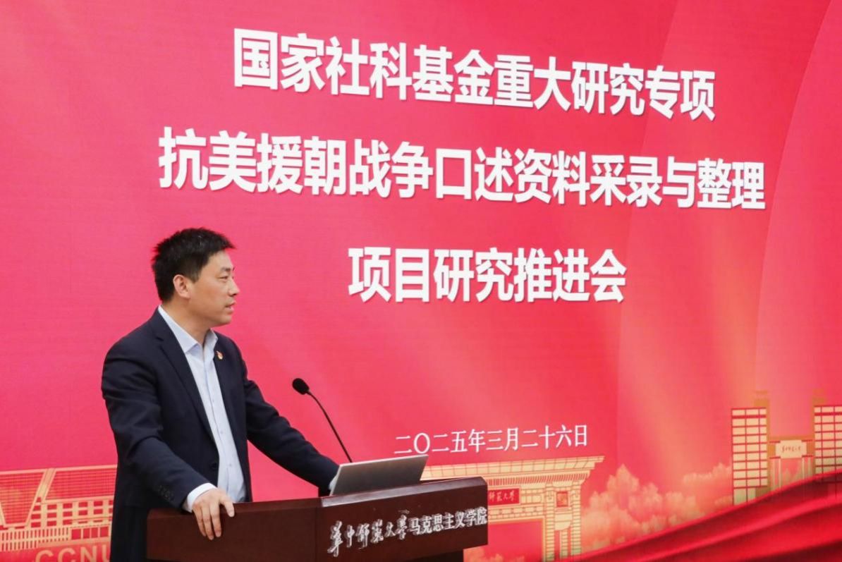 华中师范大学社科处副处长蔡鹏致辞,他对到场的专家、老师和同学们表示了衷心感谢,并指出抗美援朝不仅打出了国威军威,也锻造了伟大的抗美援朝精神,是我们党和国家军队及人民的宝贵精神财富。华中师范大学马克思主义学院作为全国重点马克思主义学院、全国党建标杆院系,长期以来秉持着严谨的学术态度和强烈的社会责任感,在马克思主义理论研究以及意识形态领域发挥着重要作用。此次研究是传承红色基因引弘扬爱国主义精神的重大举措,他提出要深刻学习领会习近平总书记关于抗美援朝战争的重要讲话精神,以高度的责任感和使命感对待这项工作,站在为国家存史、为民族立传的高度,充分认识该项目的重大意义,确保项目高质量完成。