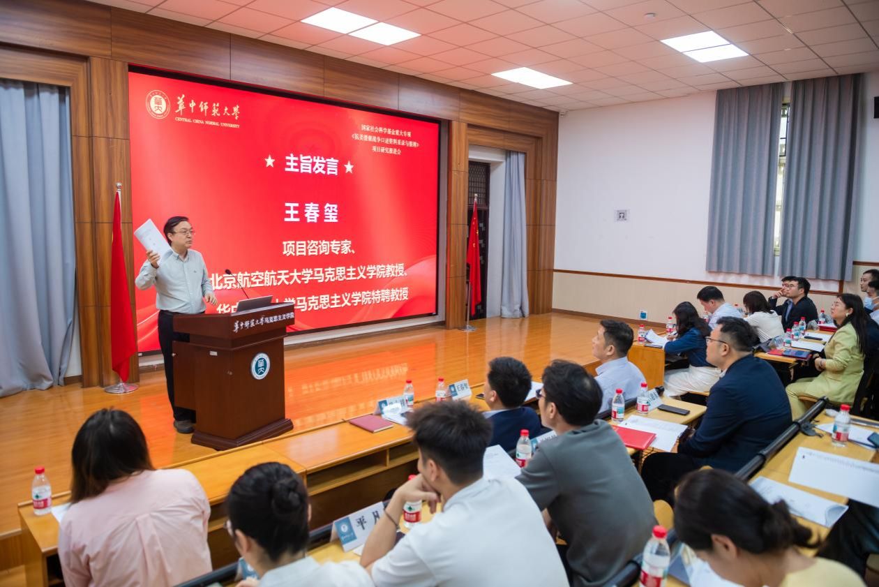 项目咨询专家、北京航空航天大学马克思主义学院王春玺教授作主旨发言。他结合华中师范大学的红色文化传统,提出以恽代英、章开沅等众多代表人物为脉络感悟红色基因,并分享了对抗美援朝期间中美关系、中国共产党与国民党关系的历史见解,联系当今生活实际,指出此次研究的重大意义。他还着重强调以口述史来进行实证研究的意义,要着力挖掘,围绕抗美援朝战争开展各维度视角研究。