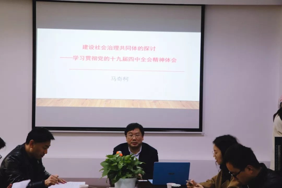 随后,马奇柯书记从深刻解读党的十九届四中全会的主题、理解我国治国理政的制度逻辑与建设社会治理共同体的重大举措三个方面展开讲解。马奇柯老师深刻分析了党的十九届四中全会的主题,同时也强调了一个《决定》回答了“坚持和巩固什么,完善和发展什么”这个重大政治问题。