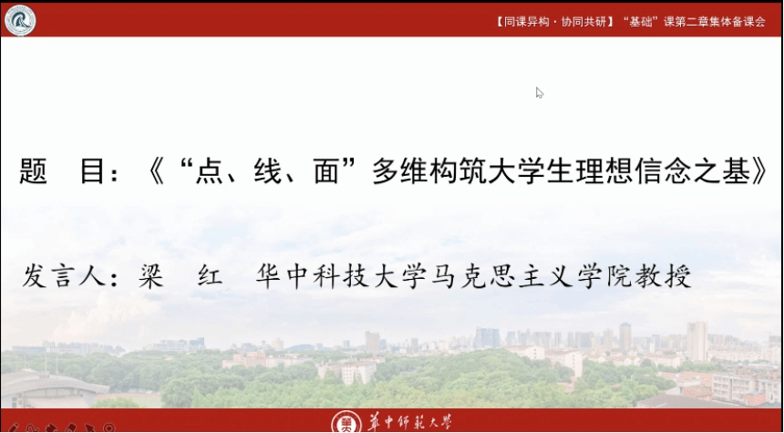 在教学分享阶段,华中科技大学马克思主义学院梁红教授结合自身感悟,做了题为《“点、线、面”多维构筑大学生理想信念之基》的主题发言,梁红教授从一个出发点、一条主线、一组作业三个方面展开讲解,在讲授本章时她注重挖掘马克思恩格斯全集的经典语录来启发同学们要明确自己的责任和使命;强调从人的本质出发,理解个人价值与社会价值之间的联系。