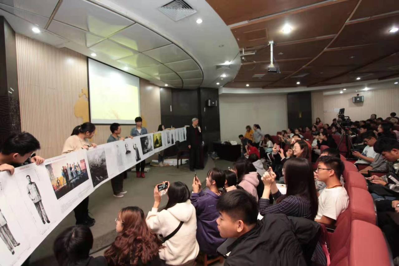 在现场,刘三多先生特意进行了作品展示,其中有四幅作品集更是达到能够绕场一周的长度,先生对其逐一进行了详细地讲解,现场气氛热烈,师生们更是叹为观止。随后,先生又一一展示了王争艳、孙东林、吴天祥、董明等道德模范系列作品,并且讲述了每一位英模的感动故事,无不饱含着他对英模人物的敬佩。此外,先生还当场赠送了我院一幅名为《行走中的习近平》画作,在此致以最诚挚的感谢。在话语的最后,先生分享了他的80岁人生感悟,其蕴含的哲理更是引人深思,发人深省。