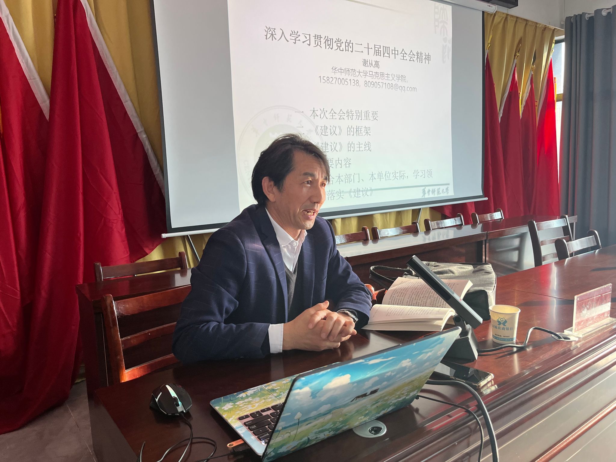 马克思主义学院谢从高教授在应城市义和镇结合《建议》以“乡村全面振兴”为重点,讲解农业农村现代化关系中国式现代化全局和成色。就坚持把解决好“三农”问题作为全党工作重中之重,促进城乡融合发展,持续巩固拓展脱贫攻坚成果,推动农村基本具备现代生活条件,加快建设农业强国等内容,与基层干部群众共话乡村全面振兴。
