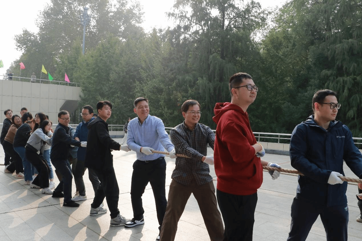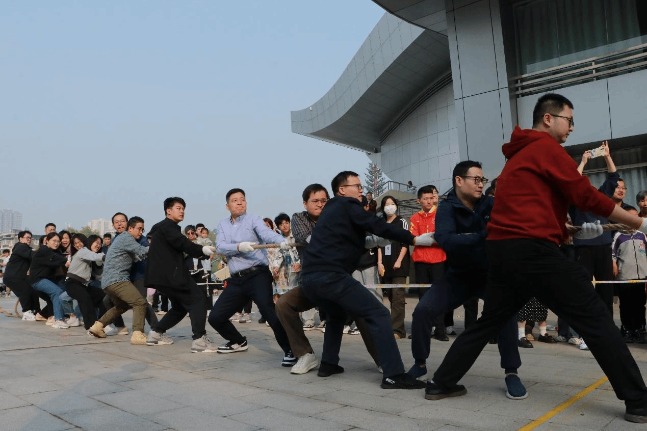 他们紧握长绳,身体微微后仰,蓄势待发。哨声响起的那一刻,两队的队员们同时发力,展开了这场力与勇的较量。马克思主义学院的教职工们瞬间发力,倾全力于一身、集合力于一绳。后排的老师们的脚步稳稳钉在地面上,像深扎在土壤的树根,为整支队伍提供坚实的支撑。汗水从每个人的额头滑落,他们咬紧牙关,用力地向后拽着绳索,眼神中透出不服输的坚毅。这场拔河比赛不仅是力量的比拼,更是对团队的磨砺与团结的见证。