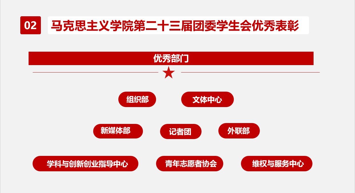 最后,陈陈瑾对于团委学生会工作做出总结,她表示所有“团学人”都是我院“高光时刻”的缔造者,在任期工作中创造了我院历史上的“五个首次”——马院团委学生会首次独立开展骨干培训、首次获得省级荣誉、首次获得校级优秀组织单位荣誉称号、五年以来首次获得红旗团委荣誉称号、三年以来竞选主席团书记处候选人员首次达到最多,本年度团委工作考核排名全校第三,并且对团委学生会成员提出了关于未来学习生活的建议,鼓励大家确立明确目标,夯实专业知识,掌握新技能,为未来做充足准备。
