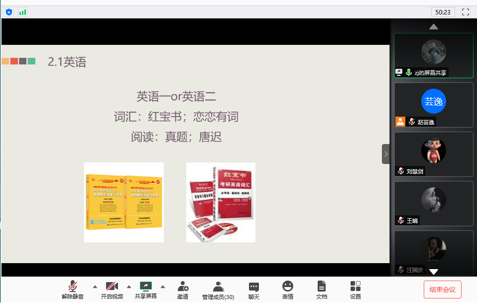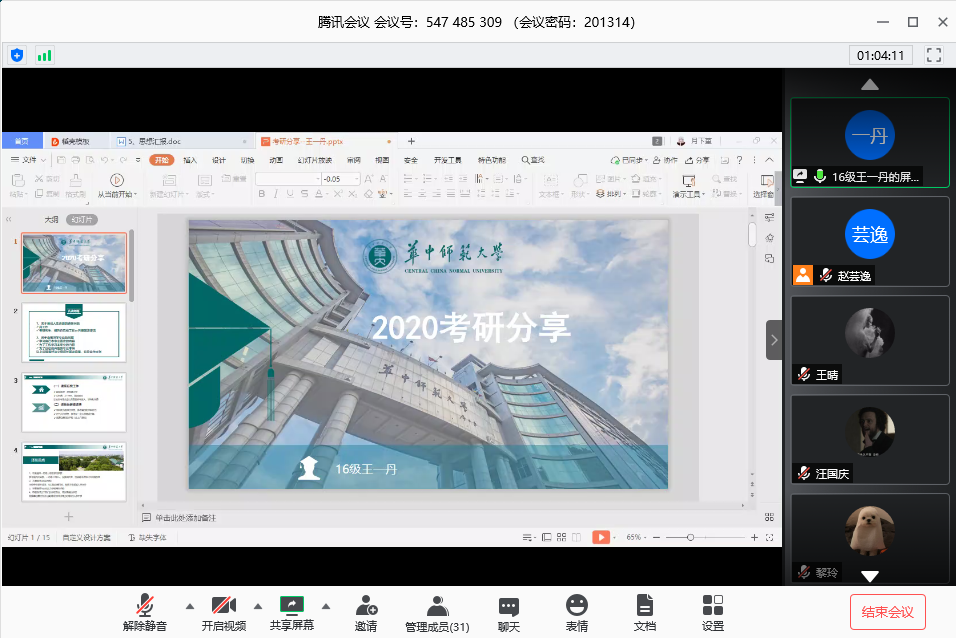 马克思主义学院讯(通讯员 于淼)5月31日晚,我院“学长学姐说”活动通过线上会议室顺利举办。思想政治教育本科2016级张健、王一丹、赵蕙伊桐、罗琳等4名优秀毕业生,分别就各自的考研、保研经历经验展开分享,并对同学们提出的问题进行答疑。活动旨在发挥马院学子榜样带头作用,并为学院本科生考研、保研指明方向。活动由2017级本科生辅导员赵芸逸主持。