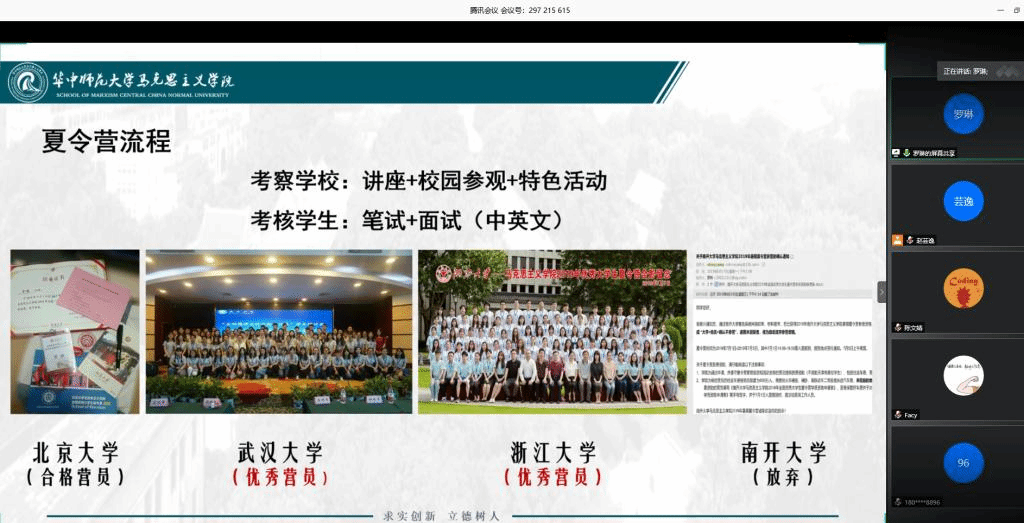 保研至复旦大学的赵蕙伊桐以《2020年复旦大学马克思主义学院全国大学生夏令营活动通知》为例,为同学们详细讲解了夏令营的申请资格、材料的撰写要点。她就自身参与复旦大学夏令营的经历,总结出三点经验:在夏令营的座谈会环节做好自我介绍,突出亮点;在专题报告环节具有问题意识,大胆发言;在专业综合面试环节结合平时积累,明确思路等。