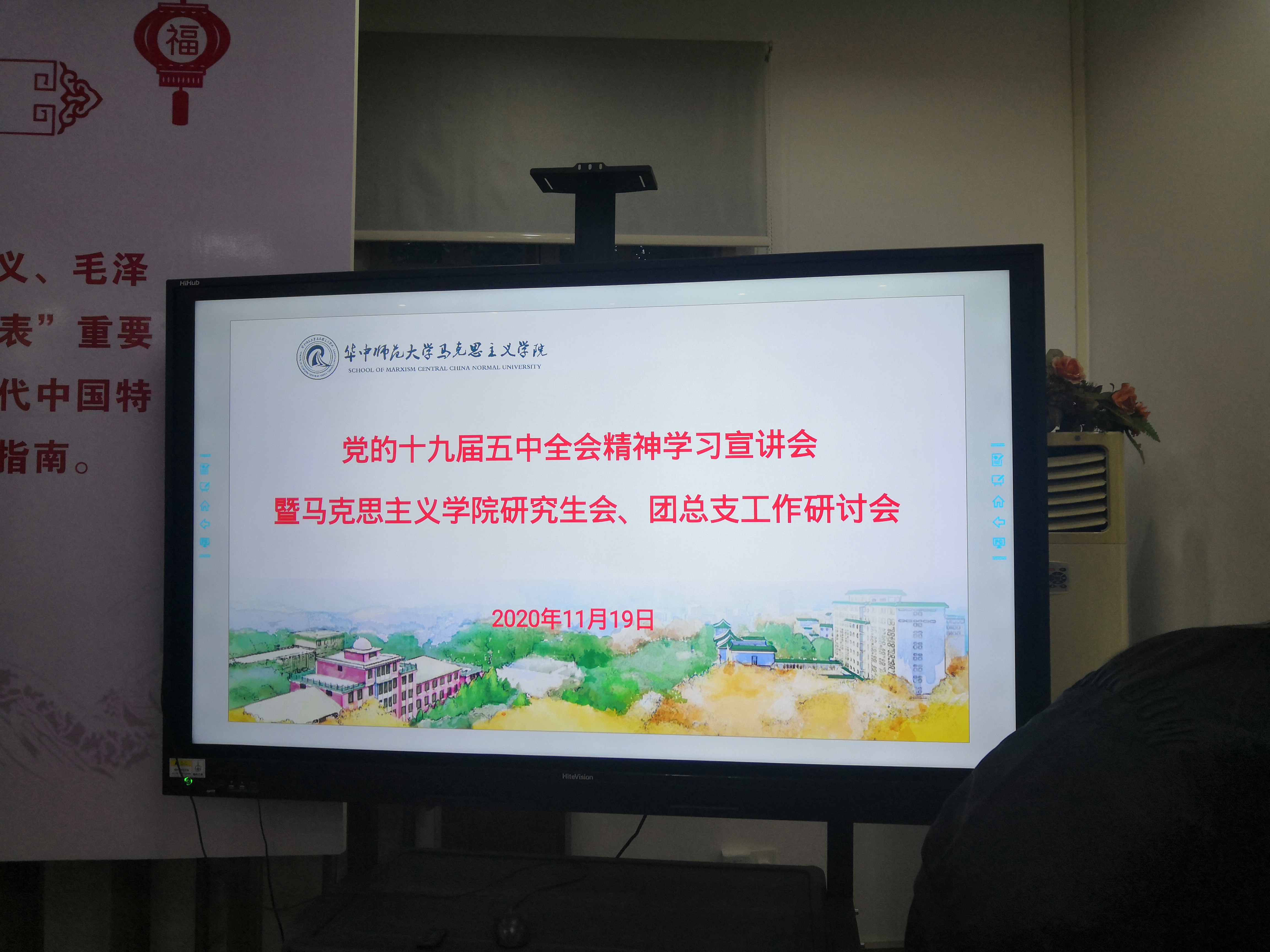 马克思主义学院讯(记者 孟恒艳;摄影 孟恒艳)2020年11月19日下午2点30分,党的十九届五中全会精神学习宣讲会暨马克思主义学院研究生会、团总支工作研讨会在一号楼党员活动室顺利召开。参加本次会议的有正处职组织员董俊敏,研究生会、团总支指导老师、2019级研究生辅导员丁琳老师,以及研究生会、团总支两大学生组织的主要学生干部。本次会议的召开旨在学习党的十九届五中全会精神,联系当下的十四五规划做好研究生会、团总支的工作计划,以便更好地聚焦时代主题开展后期工作、服务同学。