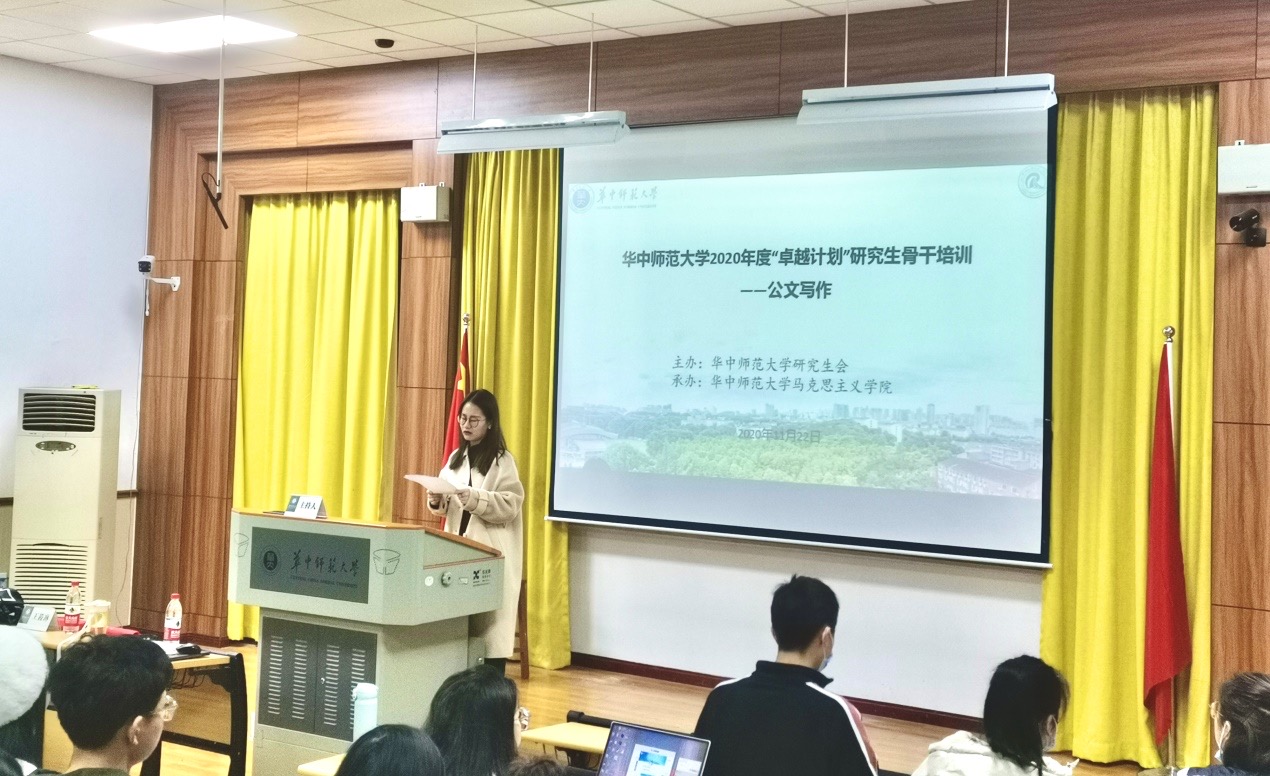 马克思主义学院讯(记者 沈沫;摄影 张亚鹏)2020年11月22日上午9时,由华中师范大学研究生会主办、马克思主义学院研究生会承办的华中师范大学第四届“卓越计划”研究生干部培训—公文写作培训在马克思主义学院1101教室举行。本次培训邀请湖北华图教育名师团教师王筱琳作为主讲人,马克思主义学院研究生会主席高瑜茜主持此次培训,现场座无虚席、气氛活跃。