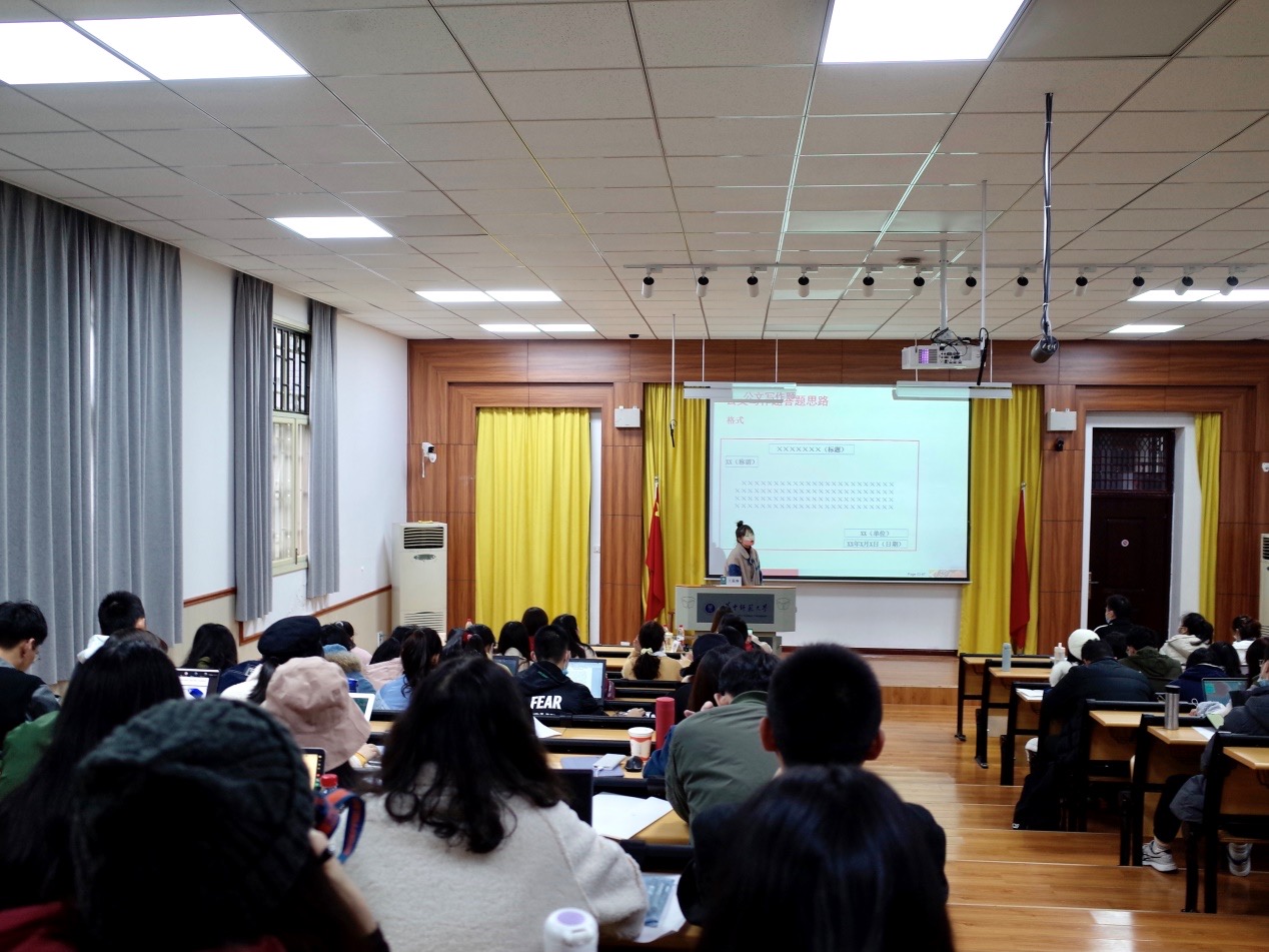 活动伊始,高瑜茜对主讲人王筱琳老师做了简要介绍,同时讲述此次培训意义和考评指标。紧接着,王老师从应用文写作基础知识、公务员考试中公文写作的阅卷特征、真题讲解三部分展开培训内容讲解。王老师从题型概念入手,阐述了法定公文和事务性文书的相关知识和写作要求。对于法定公文,王老师进行简单介绍并强调审题的重要性,介绍了应用文的结构,论述了应用文的阅卷特点。针对事务性文书,王老师进行了不同文种的详细分析和讲解,指出正文的书写一般应当遵循“背景—是什么—为什么—怎么做”的逻辑思路。王老师不仅对理论知识进行了详细解释,还结合典型例题对倡议书、讲解稿、宣传稿、编者按等事务性文书的写作进行了实际训练。同学们也努力思考,积极回应,现场气氛十分热烈。最后,王筱琳老师根据同学们的普遍疑惑,对公文写作的备考和训练提出了有效建议。