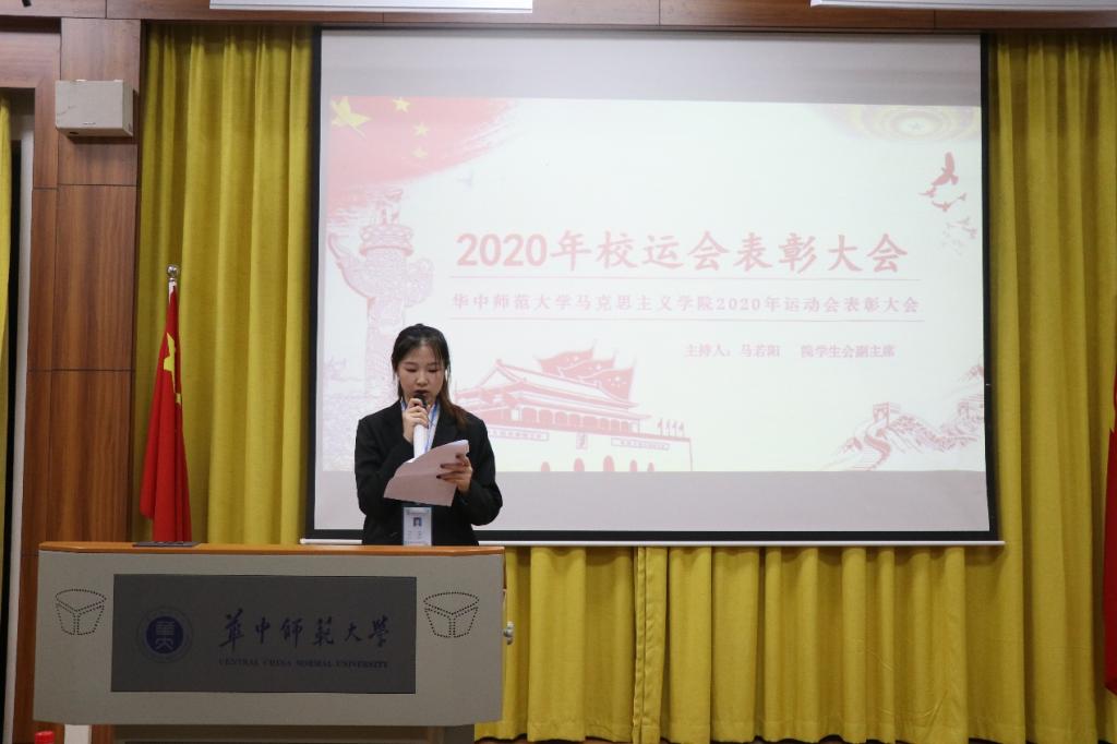 马克思主义学院讯(记者 袁铖;摄影 谢泽婷)为表彰先进、树立典型,进一步提高马克思主义学院学生参与体育活动的热情,马克思主义学院于11月22日在一号楼1101教室举行2020年校运会表彰大会。本科生辅导员兼团委书记陈陈瑾、本科生辅导员王海龙、赵芸逸、李静宜、黄洁旋出席会议,校运会优秀运动员、优秀工作人员、优秀志愿者以及2020级全体本科生参会。本次会议由马克思主义学院学生会副主席马若阳主持。