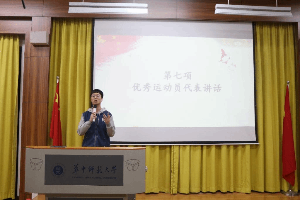 颁奖结束,优秀运动员代表陈培浩发言。他谈到,运动能使人身体健康、心情愉悦。课业压力较为繁重时,运动能起到调节心情的作用,良好的身体素质、愉悦的心情也能提升人的学习效率。他建议同学们多参加体育锻炼,增强体质,以更好的状态投入到学习生活中。