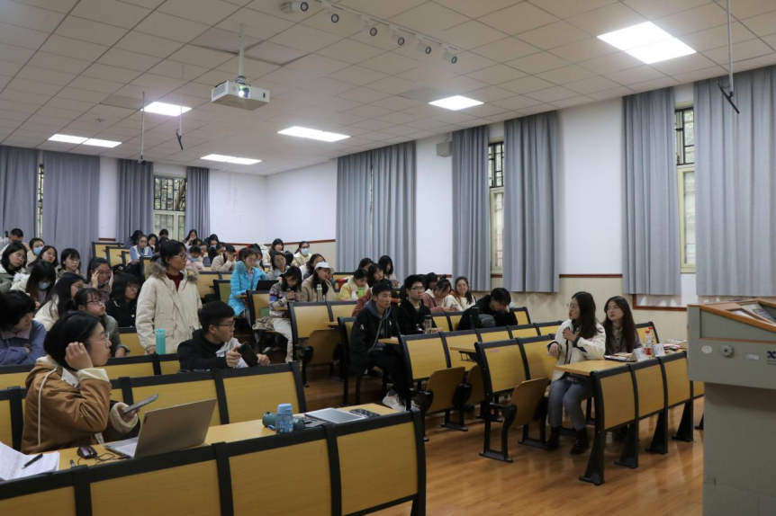 问答环节,我院学子踊跃提问,王银凤、潘越进行细致回答。公费师范生提问主要聚焦在高中教材与马列经典原著关系、辅修含金量、支教机会等方面。王银凤表示高中教材与马列经典原著有一定的联系,深入研究经典原著能增加课堂趣味性,启发学生思考。非公费师范生提问则主要集中在海外交流经历、学科夏令营以及大一阶段科研途径方面。潘越指出,上述问题都应该建立在良好的学习成绩基础之上,学术交流和科研都需要一定的理论基础。她表示海外交流经历、学科夏令营可以拓宽眼界,获得有趣的体验,科研工作是一个循序渐进的过程,大一阶段科研途径主要有高年级同学指引以及组建科研小组等。