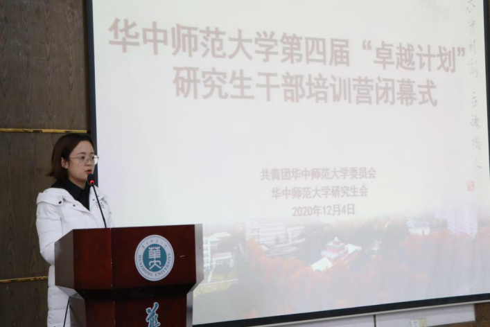 马克思主义学院讯(通讯员 马雪梅;摄影 杨晓芳)2020年12月4日12点30分,由华中师范大学研究生会主办、马克思主义学院研究生会承办的华中师范大学第四届“卓越计划”研究生干部培训营闭幕式在九号楼报告厅成功举行。本次闭幕式由马克思主义学院研究生会秘书处副部长李佳玥主持,华中师范大学研究生会指导老师谢定一、马克思主义学院研究生会指导老师丁琳出席,培训营全体营员参加。