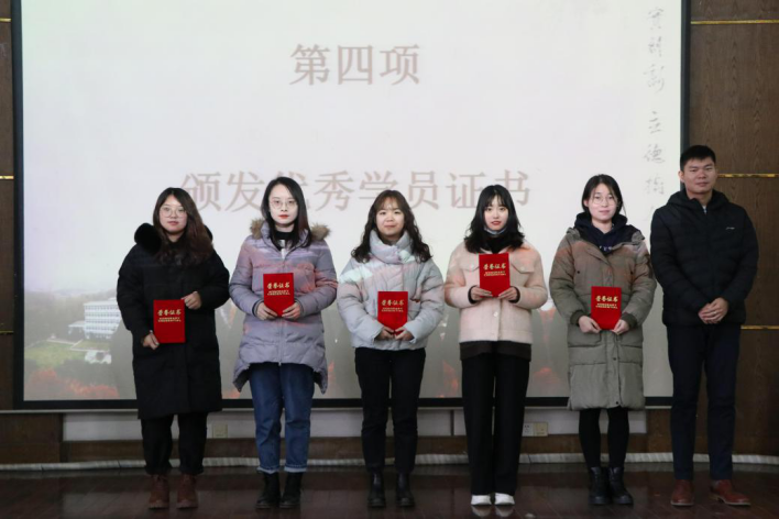 会议伊始,主持人首先带领大家回顾了半个月的培训学习历程,七次专题培训不仅让全体营员掌握了各类公文的撰写方法、人际交往语言技巧、办公软件的运用以及社交礼仪等技能性知识,也坚定了同学们做学生干部的初心和使命,进一步增强了研究生干部勇担使命、投身于中华民族伟大复兴新征程的坚定信念。随后,闭幕仪式正式开始,共设有五项议程。第一项,全体起立、奏唱国歌。紧接着,由马克思主义学院刘晓慧同学作为优秀学员代表发言。刘晓慧同学从学习知识、提升自我和团结合作、彼此帮助两个方面谈了自己的学习感受,并希望大家能够不忘初心,学有所成,为学生工作奉献自己的青春。在热烈的掌声中,由丁琳老师为刘硕等五位学员代表颁发结业证书,谢定一老师为谭琪等五位优秀学员颁发荣誉证书。稍作整理后,全体培训营员与老师们合影留念。至此,我校第四届“卓越计划”研究生干部培训划上了圆满的句号。