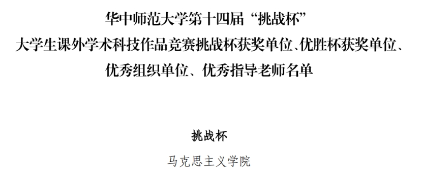 马克思主义学院讯(通讯员 方思佳)近日,校团委发布《关于表彰第十二届“挑战杯”中国大学生创业计划竞赛优秀组织单位、优秀指导教师、先进工作者和先进个人的决定》以及《关于公布华中师范大学第十四届“挑战杯”大学生课外学术科技作品竞赛获奖名单》。我院师生在“挑战杯”中国大学生创业计划竞赛中荣获国赛银奖1项,省赛银奖2项、铜奖1项,并获评“优秀组织单位”;在华中师范大学第十四届“挑战杯”大学生课外学术科技作品竞赛中获得特等奖1项、二等奖4项、三等奖3项。学院夺得竞赛最高奖项“挑战杯”。
