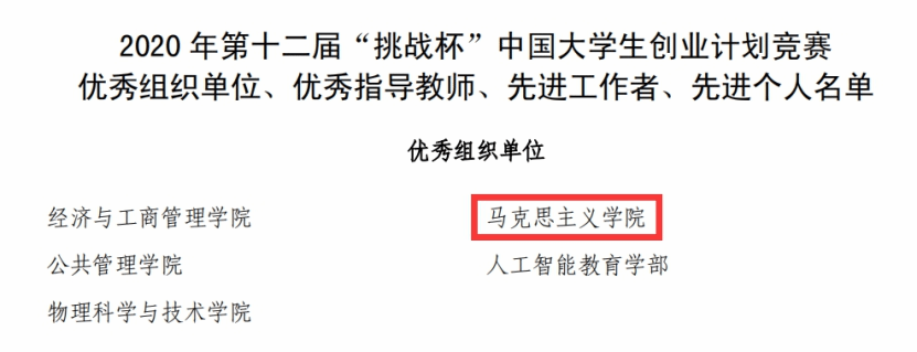 在2020年第十二届“挑战杯”中国大学生创业计划竞赛及2020年第十一届“挑战杯”湖北省大学生创业计划竞赛中,我院荣获国赛银奖1项,省赛银奖2项、铜奖1项。