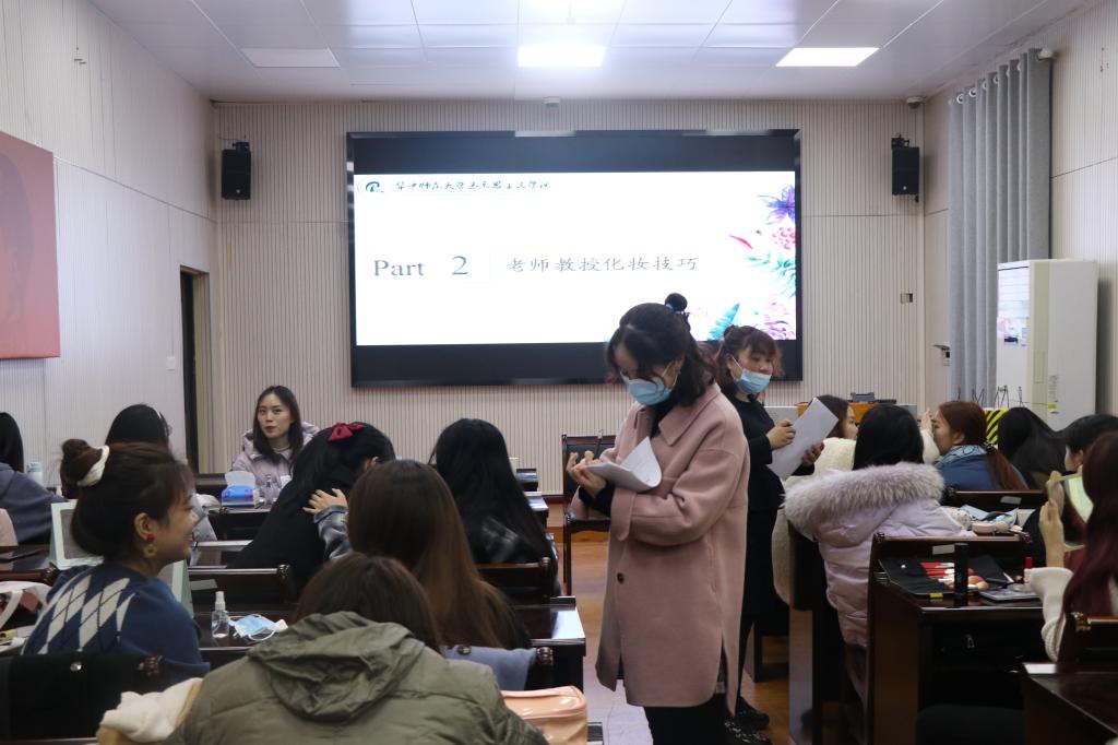 活动开始,陈莎莎和杨婷为现场的女生进行美妆指导。陈莎莎围绕化妆步骤展开讲解,第一步是清洁皮肤,做好护肤的基础,其次进行润肤、补水、隔离等步骤,最后进行画眉、画眼妆、涂口红等化妆工作,她强调化妆的浓度要根据不同的场合而定。讲解过后,指导老师从现场女生挑选模特进行演示,观众聚精会神地注视着陈莎莎的每一步动作,并结合指导老师所讲内容自主学习,在其引导下参与化妆比赛。