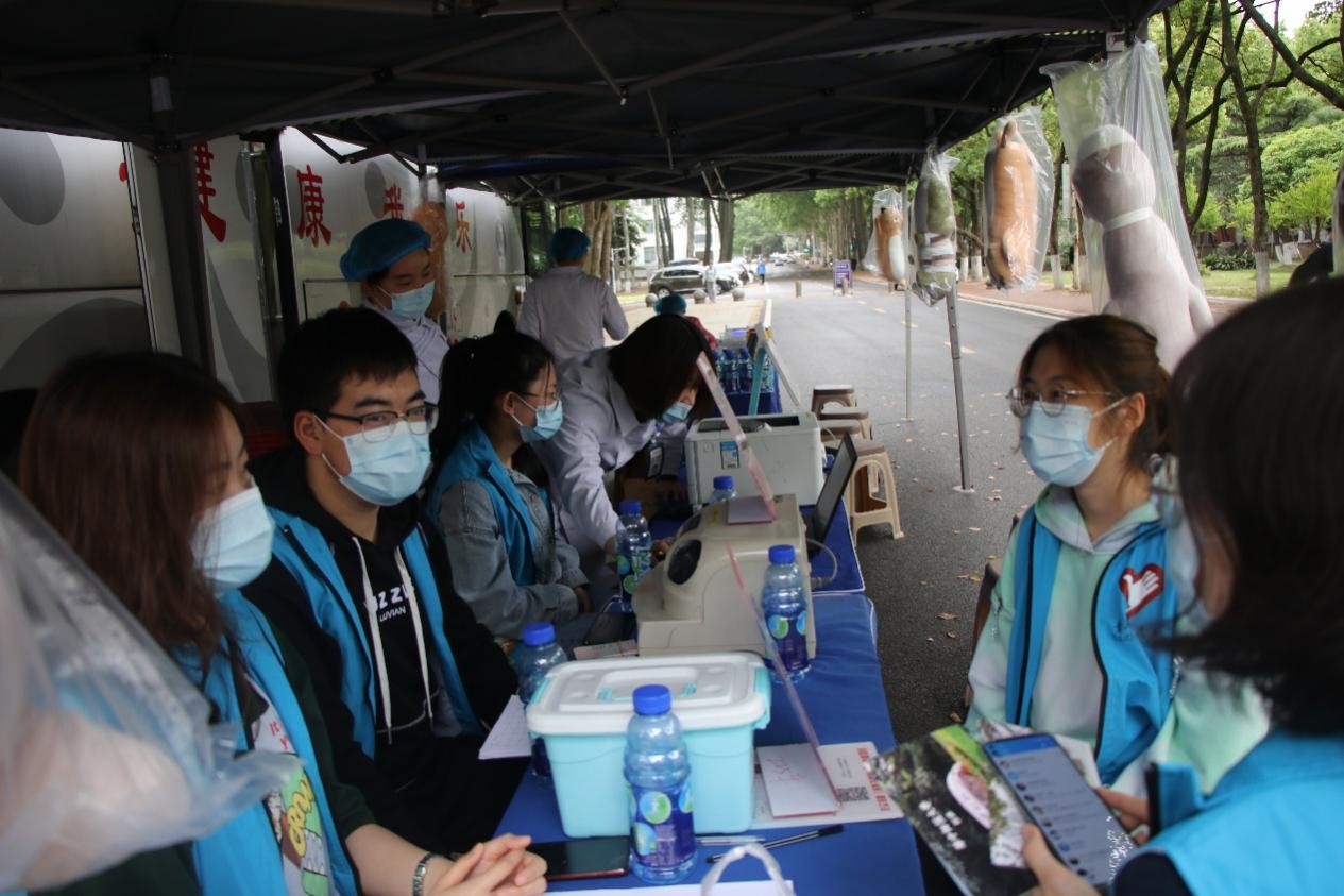 献血活动的顺利进行离不开志愿者的辛苦付出。志愿者们身穿蓝色志愿服行动在献血站,帮忙清理垃圾、协助登记、搀扶献血学生等,蓝色的身影在白色的献血车前显得格外亮眼。2020级李蕙同是本次活动的志愿者,负责帮助献血的同学登记填表。他感叹,同学们参与献血的积极性很高,整个活动过程忙碌却充满温情。在志愿协助结束后,李蕙同也挽起袖子,加入献血队伍。他说:“希望我所献的血液能帮助到那些在重症病房急需用血的病人,让他们延续生命,让爱传递下去。”