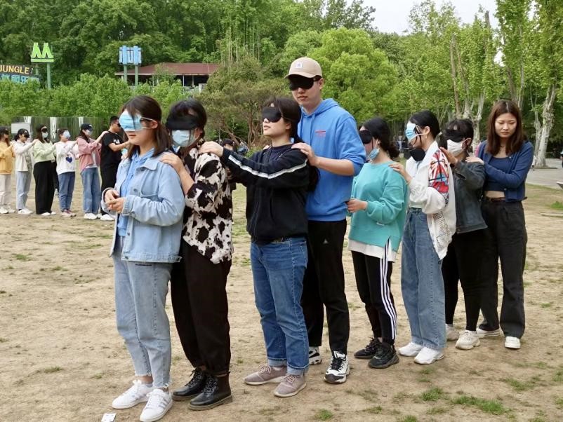 到达目的地后,春雨服务队的成员组织开展破冰小游戏,同学们被分为五队,每个小队商讨各自的队长、队名、队歌、口号、队徽,并且设计出团队的海报进行展示。各团队以积分制的形式分别参与了“扑克王牌”、“绳采飞扬”、“传声筒”、“大风吹”等趣味游戏,活动调动了同学们的积极性,激发团队潜能,增强团队协作,也使同学们释放心理压力。随之各团队以抢答的方式进行心理知识竞赛,对同学们进行心理知识的科普。