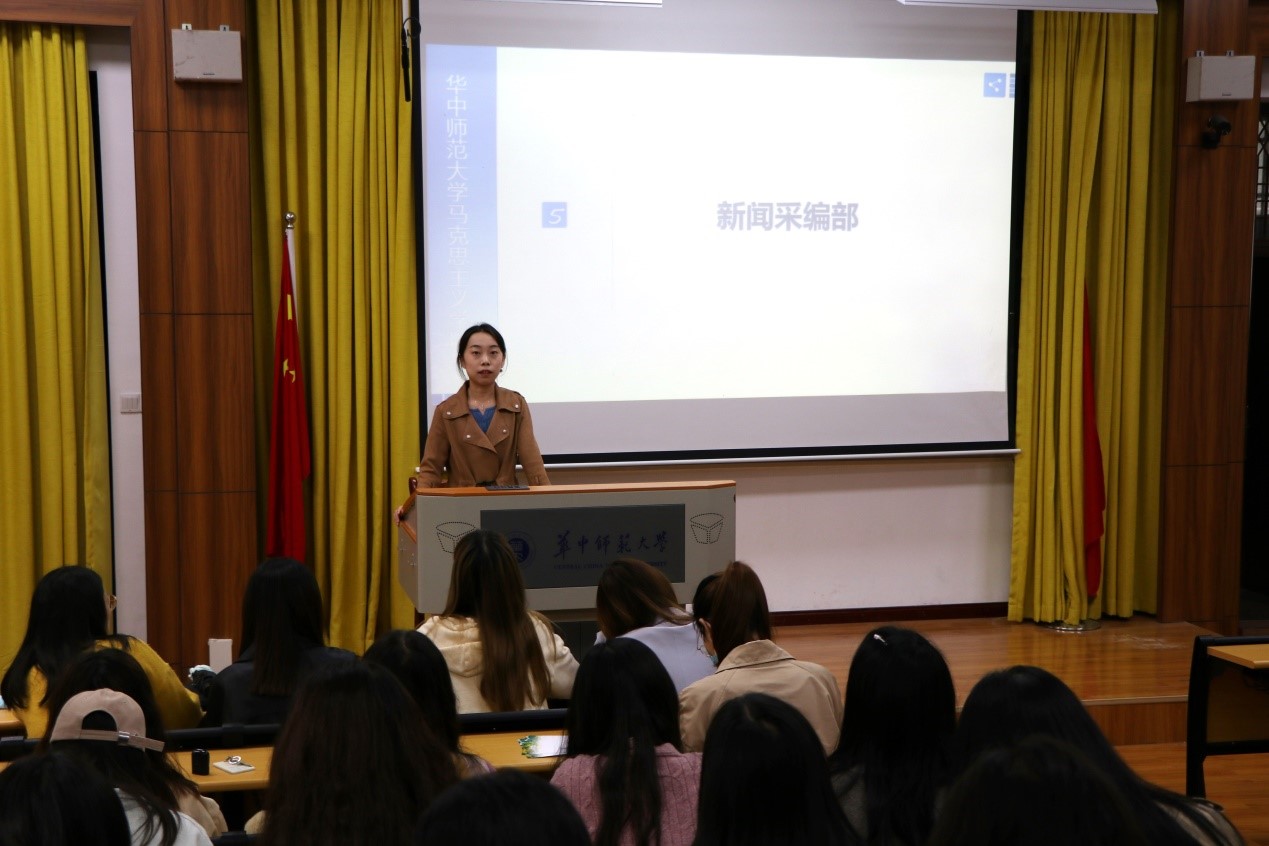 本次例会分为各部门成员发言、分管负责人工作汇报和主席总结发言三大议程。例会伊始,各部门的成员依次上台分享自己加入部门以来的感受。学术部的同学提到在学姐的指导下如今学术活动可以有序开展;体育部的发言者认为这学期活动相对上学期而言偏少,希望大家积极参与;文艺女生部成员汇报本学期举办的活动,指出其中出现的一些问题,思考解决问题的办法;生活部同学进行自我批评,反思自己因为忙于其他事情而没有积极参与到活动中,也期待研会能够举办更多有意思的活动;新闻采编部的成员上台分享自己的感受,谈到部门新推出的学术论文推荐版块得到一致好评,同时本学期部门工作机制的变化使大家工作效率提高,部门内部配合得更好,能够高质量地完成任务;秘书处发言者简要汇报近期主要完成的工作。