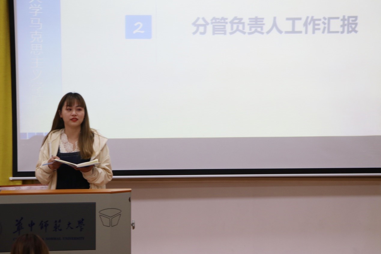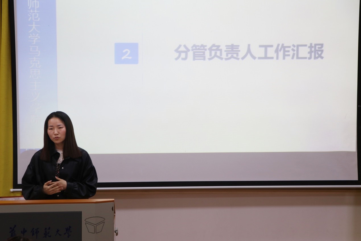 随后,各分管负责人进行工作汇报。分管秘书处的肖鑫详细说明本学期秘书处开展的工作,再次强调研会考核制度,并指出加强研会凝聚力需要协调好个人和集体两者之间的关系。分管学术部和生活部的林晓宇阐述学术讲座签到规则的修改,指出生活部会举办一些高质量的活动,着重强调研会的初衷是为了服务同学,所以成员们要摆正心态,认真对待工作,加强部门之间的沟通交流。分管文艺女生部和体育部的方宇琴强调大家应保持初心,站好最后一班岗,顺利完成交接工作。分管新闻采编部的孟恒艳简要介绍部门的常规工作,同时期望大家继续保持积极的工作状态,将研会建设得越来越好。