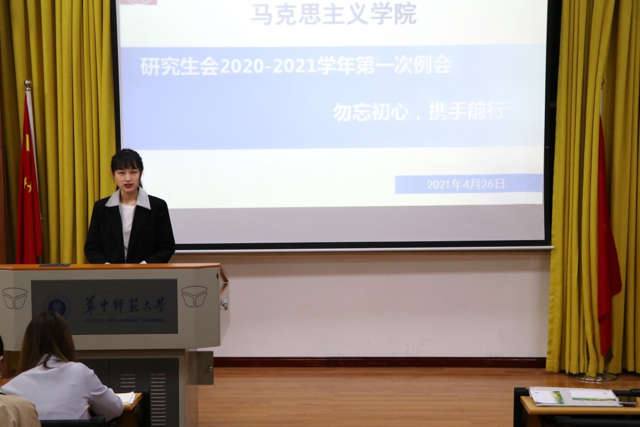 马克思主义学院讯(通讯员 陈思;摄影 阮妍青)2021年4月26日中午12点30分,以“勿忘初心,携手前行”为主题的马克思主义学院研究生会2020-2021学年第一次例会在1号楼1101教室顺利召开,参加本次会议的有马克思主义学院研究生会主席团和各部门的成员。例会的召开旨在总结前段时间的工作,展望今后的工作,不忘初心,推动研会的进一步发展。