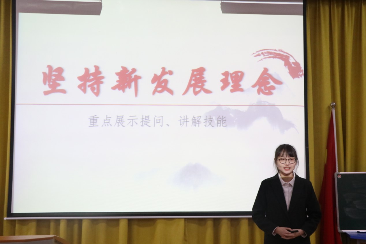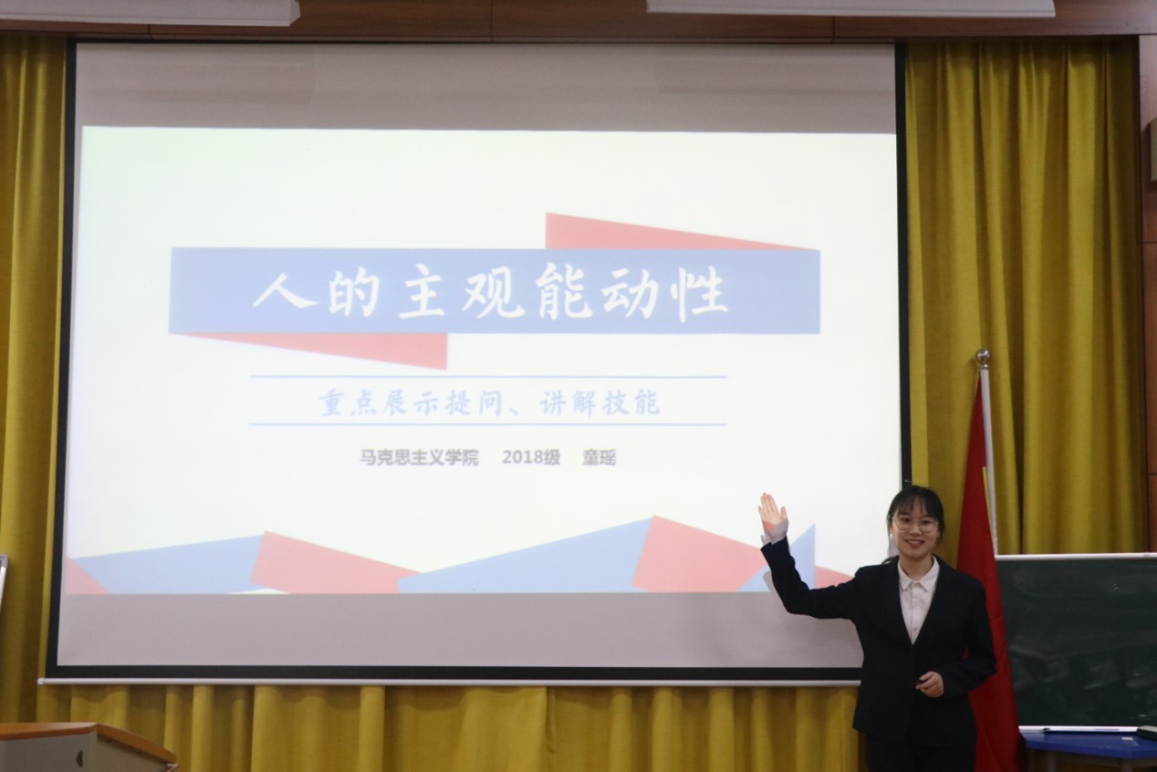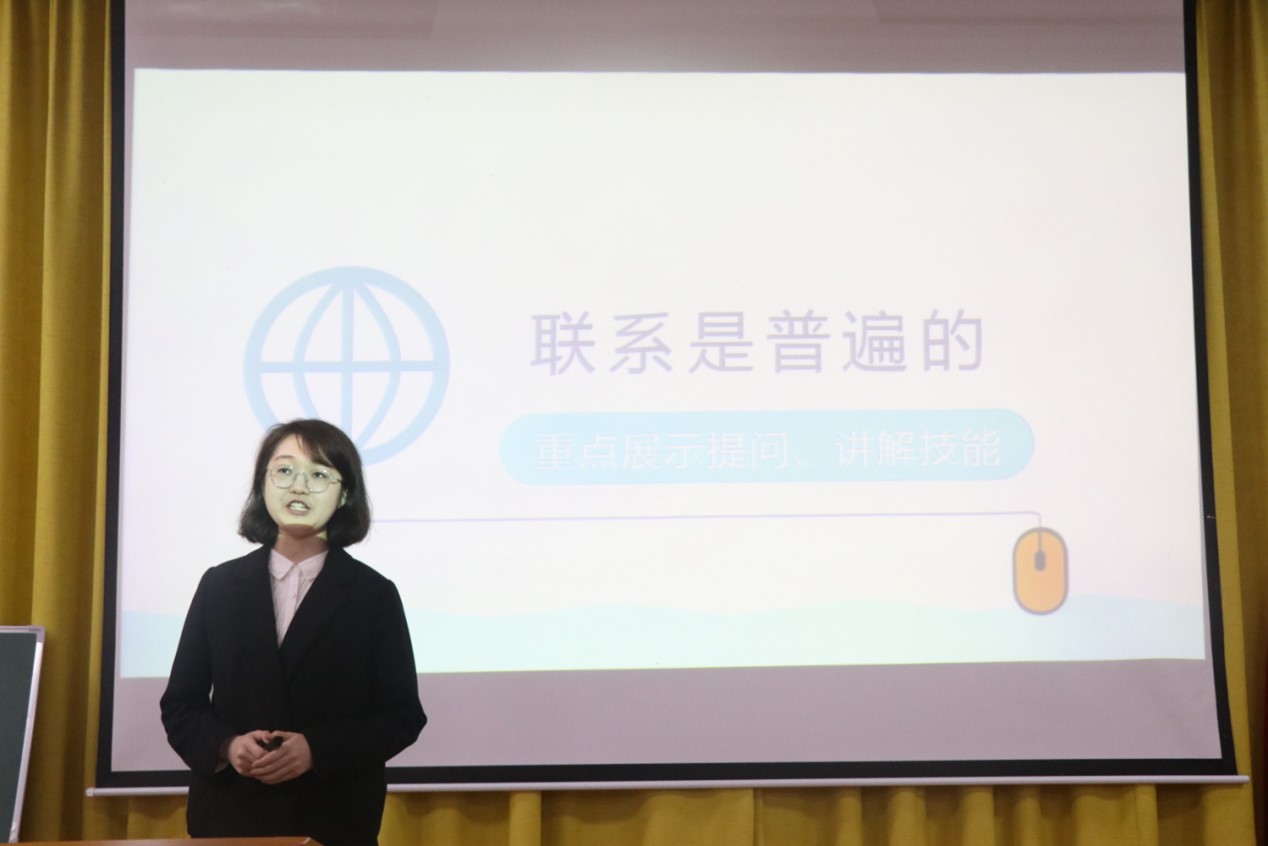 比赛分为说课、模拟授课和评委点评三个环节。在“新时代的科学内涵”这一教学片段设计中,2018级方敏采取情景教学法,以“红船”的发展历程导入,调动了学生的积极性。针对抽象的哲学知识,2020级王雅菁在讲授“联系是普遍的”这一教学片段时,联系时政热点新冠疫苗接种展开教学,引导学生将知识点与实际生活相结合。