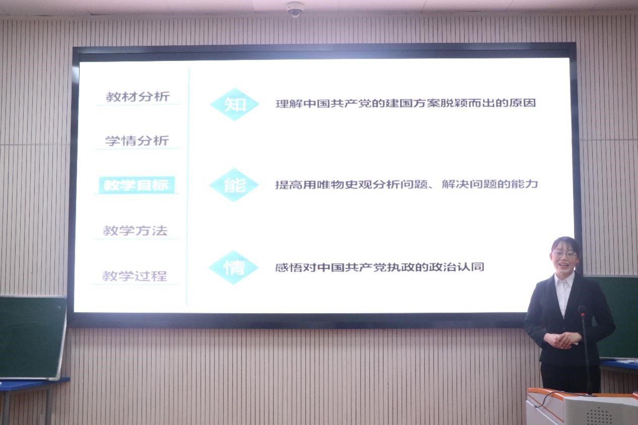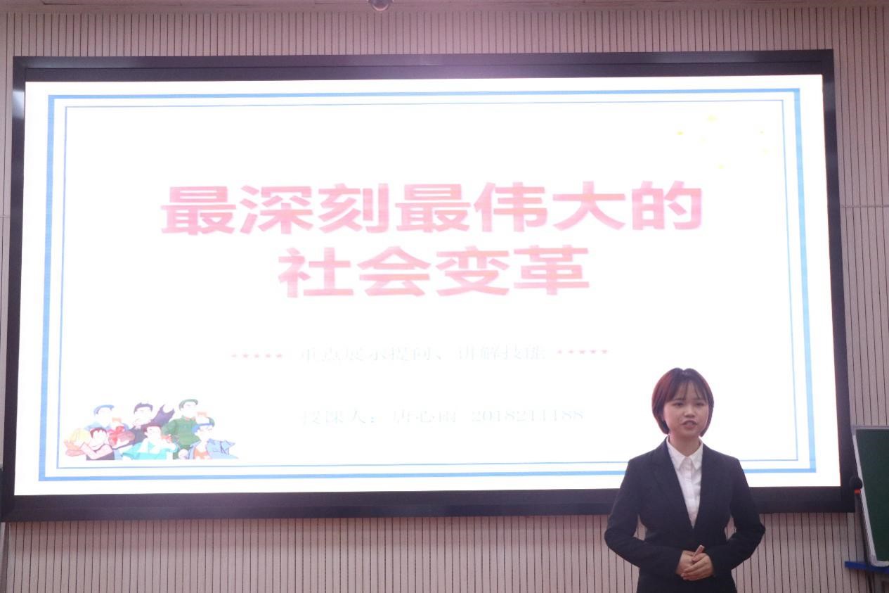 02号选手熊家露独具匠心,为学生准备了一场“时空之旅”。她用低沉的语调描述20世纪上半叶的近代中国不同阶级的建国方案,让学生更加深刻理解“各种政治力量解决中国问题的方案”。