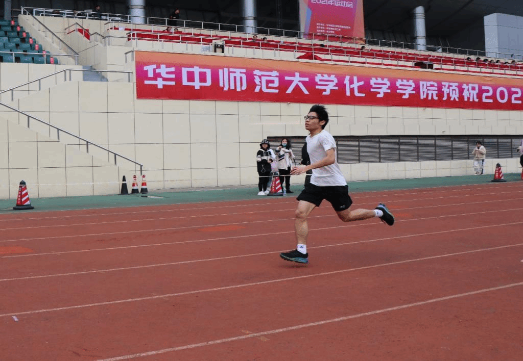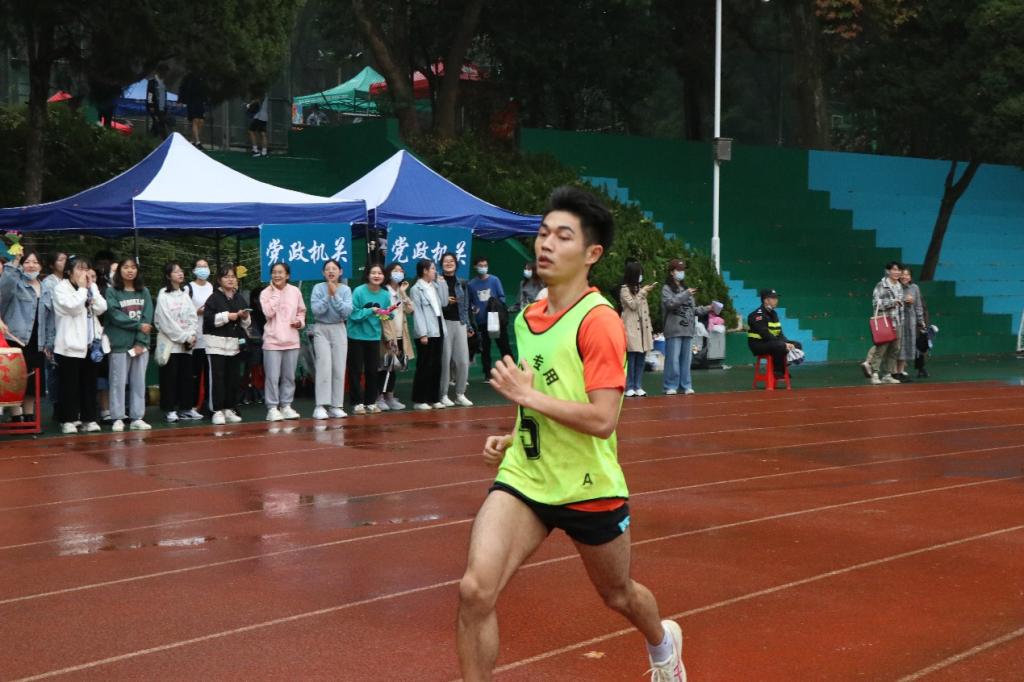 在男子1500米中长跑中,我院2020级研究生运动员杨京在比赛开始时快速进入状态,找准了步伐与节奏,在保存体力的同时保持合理的速度。第三个整圈结束后,他逐渐加大摆臂,下沉重心,开始加速,进入第一梯队。最后,杨京在同学们的欢呼声中,以小组第一的成绩完赛。