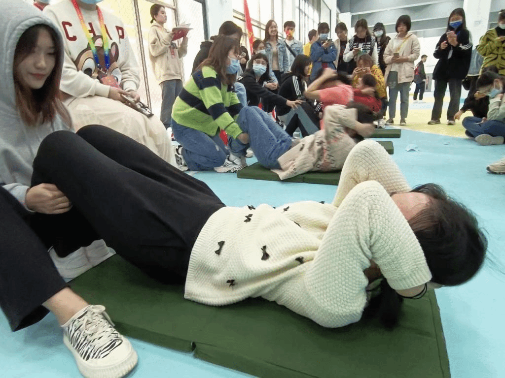 集体项目同样不失精彩。女子一分钟仰卧起坐比赛中,每一位参赛的选手们都铆足了劲。大家为动作较快的同学欢呼,也为力气相对较小的同学加油鼓劲。