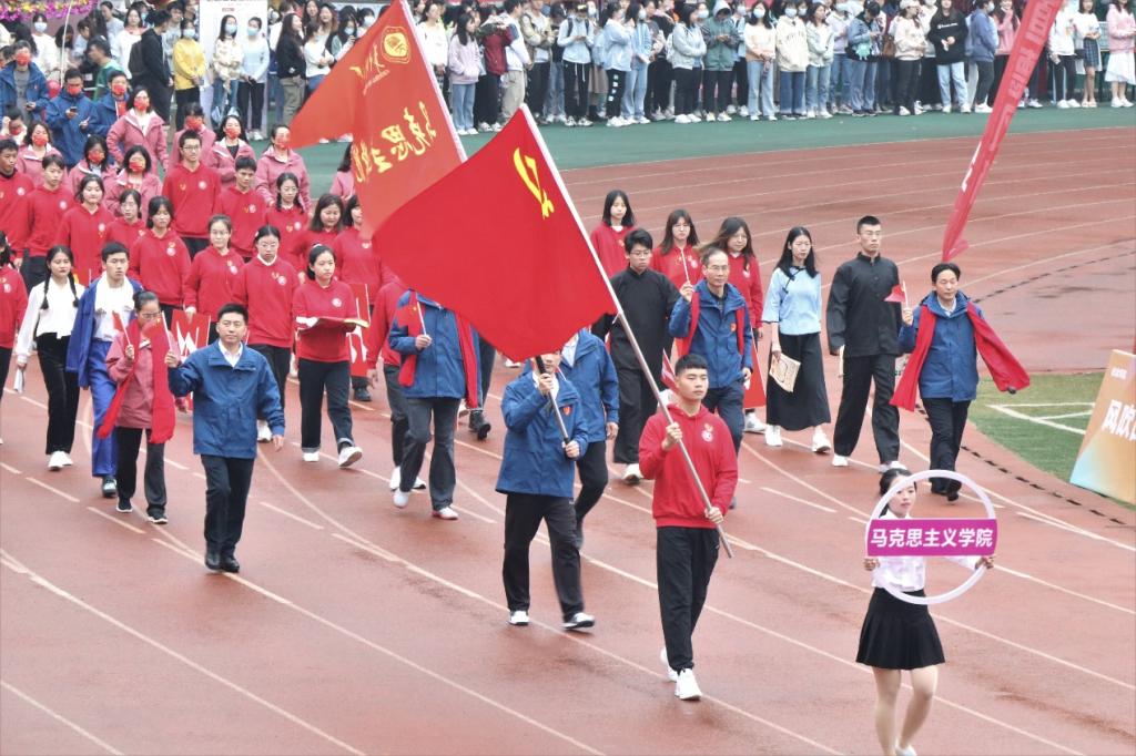 开幕式上,马克思主义学院方阵队踏着整齐的步伐入场。在方阵展示中,马院方阵队融合红色历史,回顾五四运动、红船建党、开国大典、改革开放、北京奥运、建党百年等光辉历程,凸显马院红色底色。马院方阵队独具特色的展示获得了大量来自各级领导、老师、本院及其他学院同学的好评。