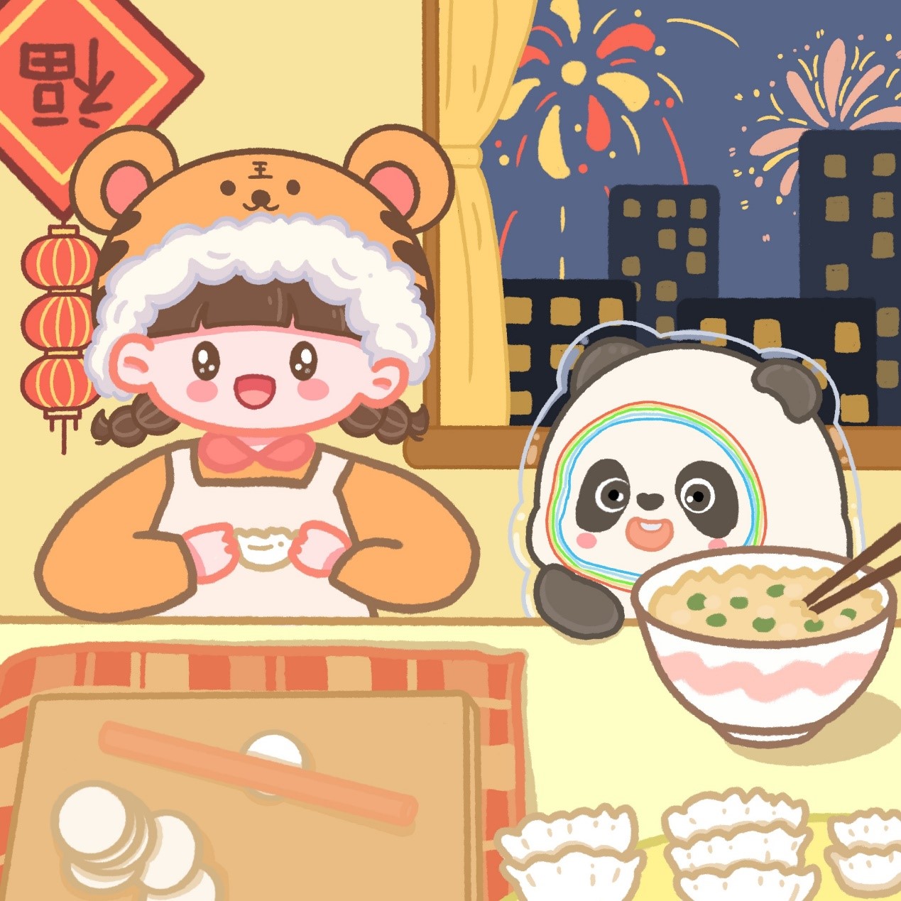 2020级本科生吴宇凡以春节期间的家庭劳动——包饺子的场景为主要内容,融入福字、灯笼、饺子、老虎(虎年)等春节传统元素,展现出年味十足的家庭劳动氛围。另春节期间恰逢北京冬奥会举行,作品中融入“冰墩墩”这一冬奥会主题元素,展现对北京冬奥会的期待与支持、对新的一年的祝福以及对未来的憧憬。