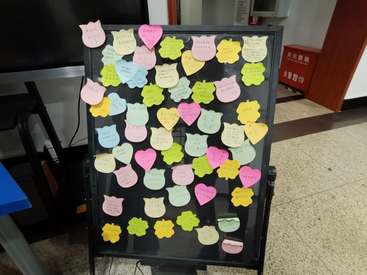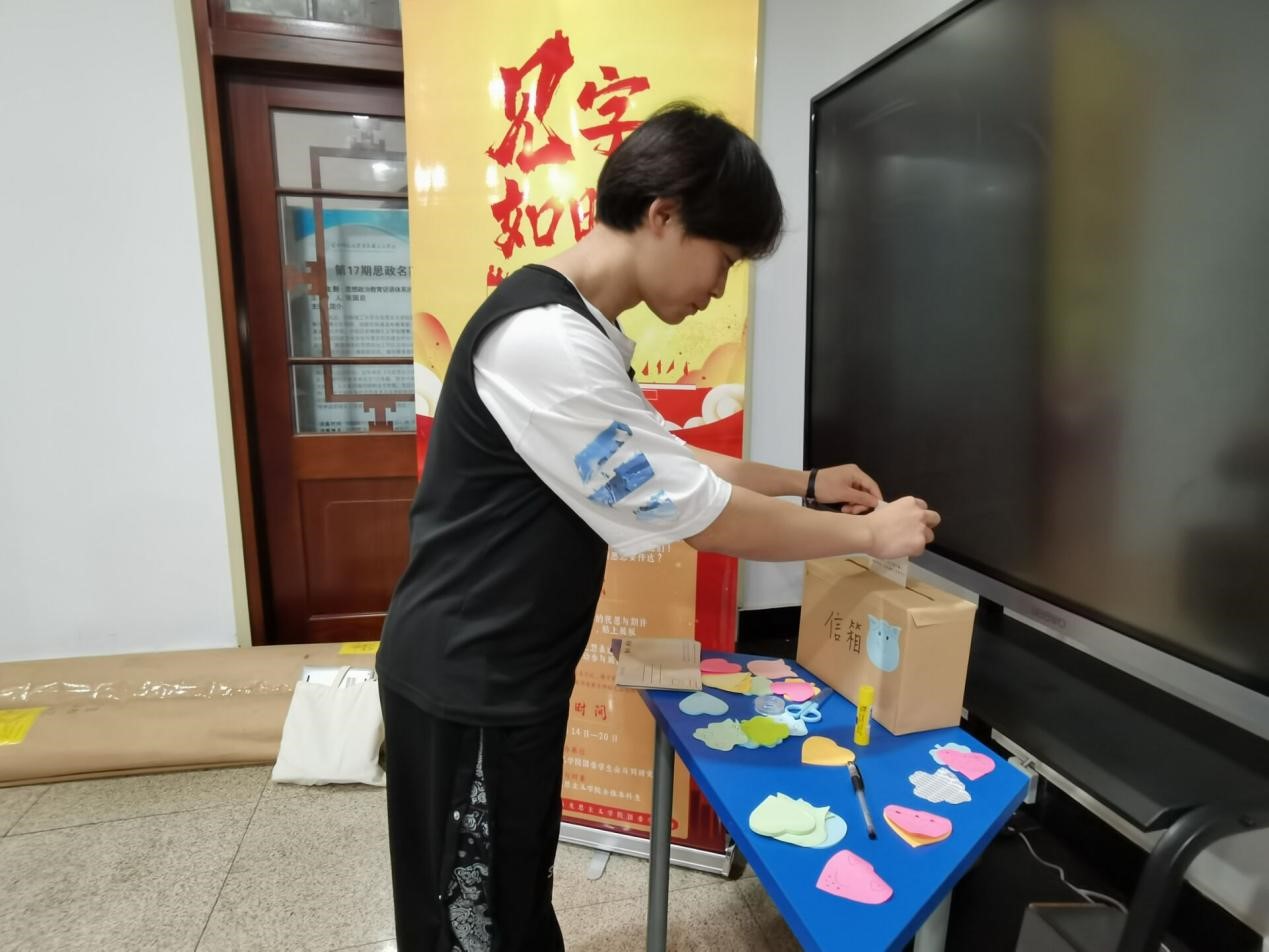 在1号楼的一楼大厅处,主办方设置有投稿信箱、留言展示板,以及明信片和便利贴。参与“缅怀历史”活动的同学自备或在活动处领取明信片,写下想对先辈们诉说的话,并将写好的明信片投入信箱;参与“展望未来”活动的同学则把自己对未来的期盼写在便签纸上,再通过留言展示板分享自己的愿望。其中,投入信箱的明信片将被公开展示于马院微信公众号,进行投票评选。