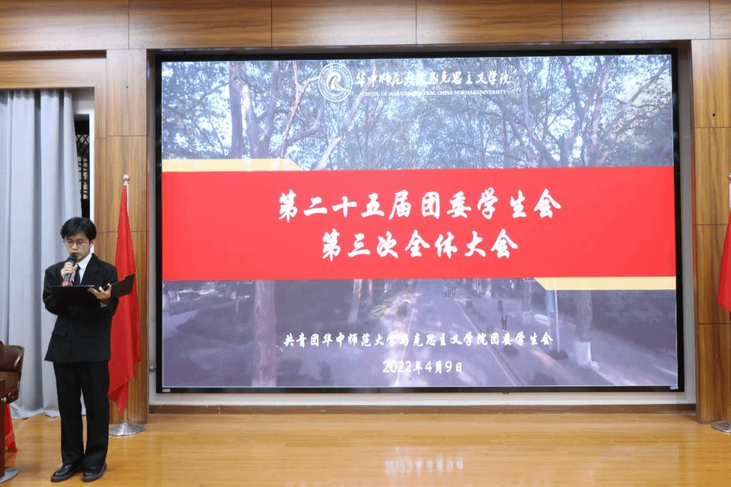马克思主义学院讯(通讯员 皮久驰;摄影 滕娇娇)4月9日下午,华中师范大学马克思主义学院第二十五届团委学生会第三次全体大会于一号楼1101教室举行。马克思主义学院团委书记赵芸逸,院团委副书记赵雨鑫、孙福泽、贺倩倩,学生会主席白晨熙,副主席李钰、方思佳出席本次会议。本次活动由团委学生会办公室成员周宗伟主持。