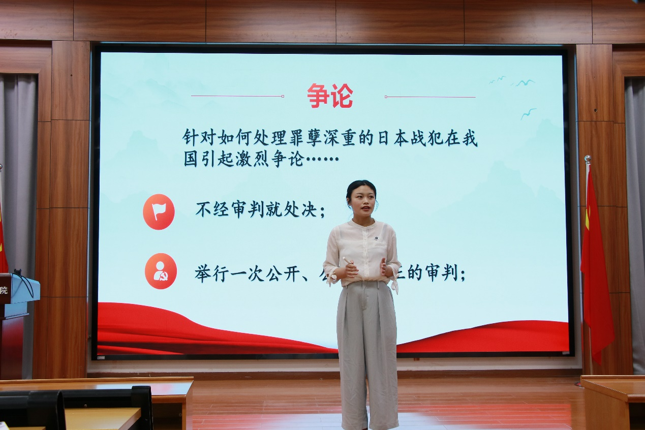 在微团课展示中,罗玉铉以“什么是你心目中的英雄”这一问题引入,向在场同学梳理了九位英雄人物的事迹,并以“袁苏妹”的事迹为例讲述了“平凡中的奉献”这一主题。杨茜介绍了沈阳特别军事法庭在审判日本战俘过程中遵循法定程序的这段历史,从中国法治思想传统说起,讲授了建设社会主义法治社会中的“程序正义”问题。