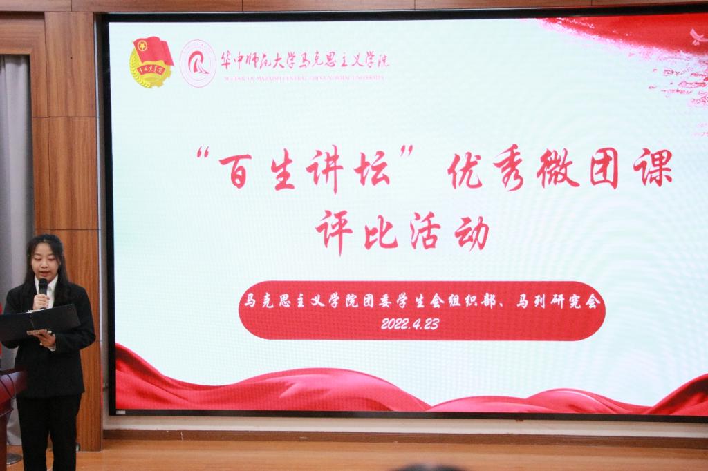 马克思主义学院讯(通讯员 黄天锡;摄影 石浩冉)4月23日下午,华中师范大学马克思主义学院“百生讲坛”优秀微团课评比活动在一号楼1101教室举行。湖北省2021年度“百生讲坛”微团课银牌获得者刘梦觉、马克思主义学院团委书记赵芸逸出席活动并担任评委。马列研究会成员杨珺尧主持本次活动。
