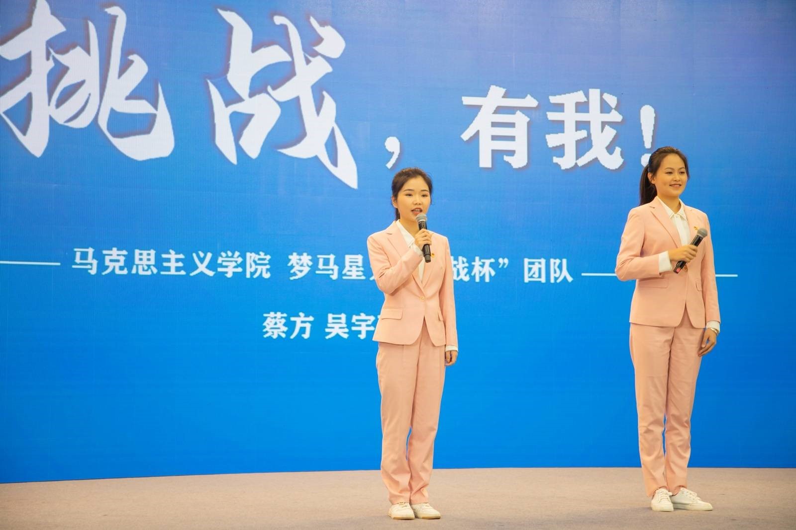 大会伊始,我院挑战杯国赛获奖团队2018级本科生蔡方、吴宇珊作为全校典型进行主题宣讲,分享了她们参加“史上最长挑战杯”的故事。