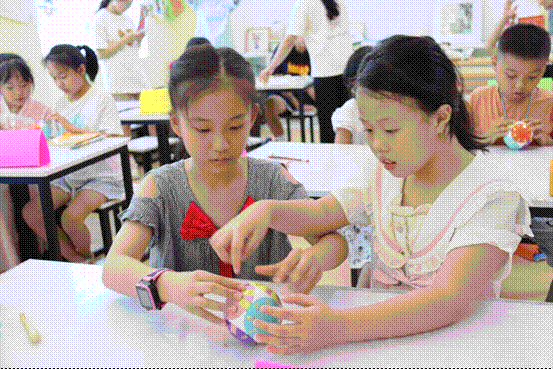 紧接着,志愿者通过加入数学运算提升目标难度,孩子们需要将对应面的滑块数字之和变动为固定的数字。孩子们尚未完全熟悉智慧球,难以完成颜色与数字结合的新目标。针对这一问题,项文慧从两个方面提出解决方案。首先,志愿者鼓励孩子们以小组分工的形式完成数字运算和滑块移动,由高年级学生带动低年级学生参与课堂,在互帮互助和合作探索中完成任务。孩子们基本掌握如何进行数学运算之后,以完成速度和完成时间为比赛内容进行小组比拼,以此激发学生学习动力。