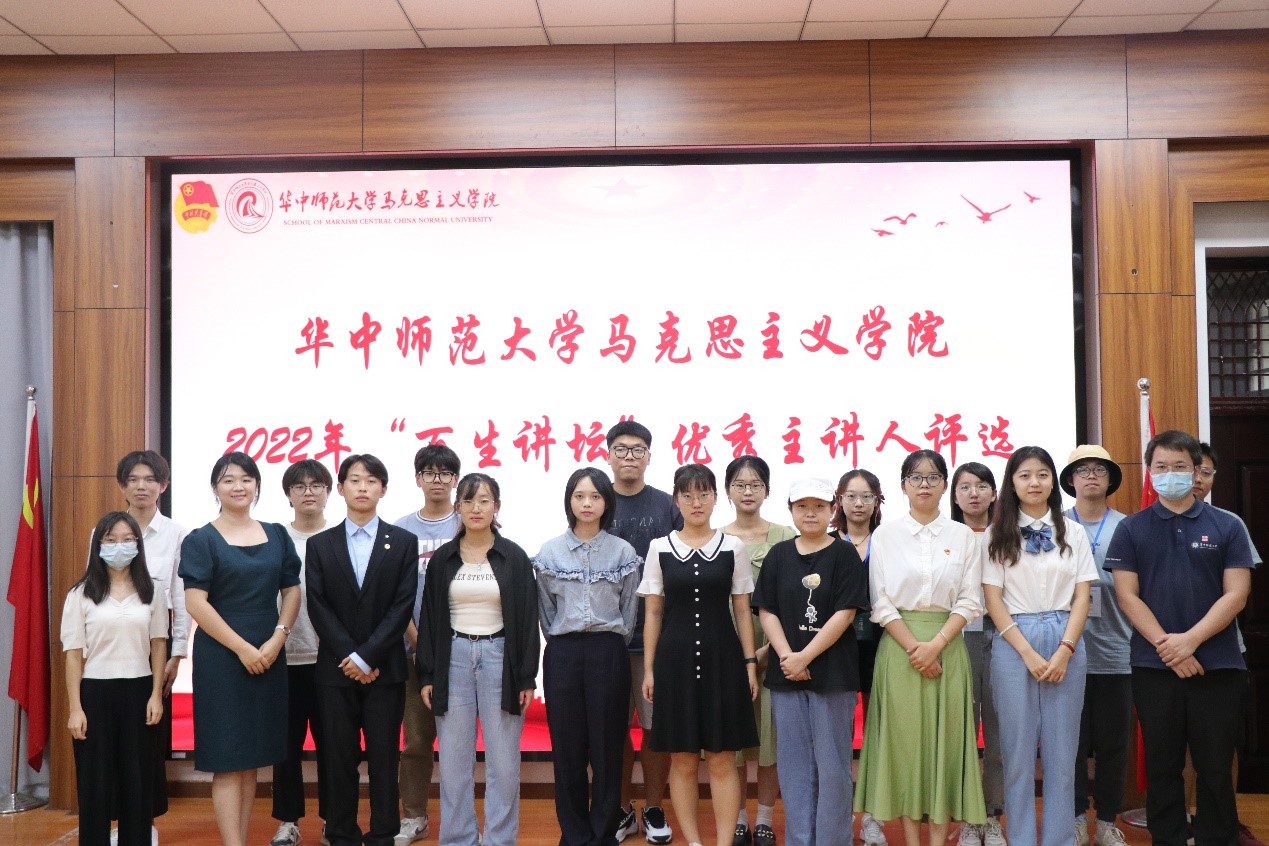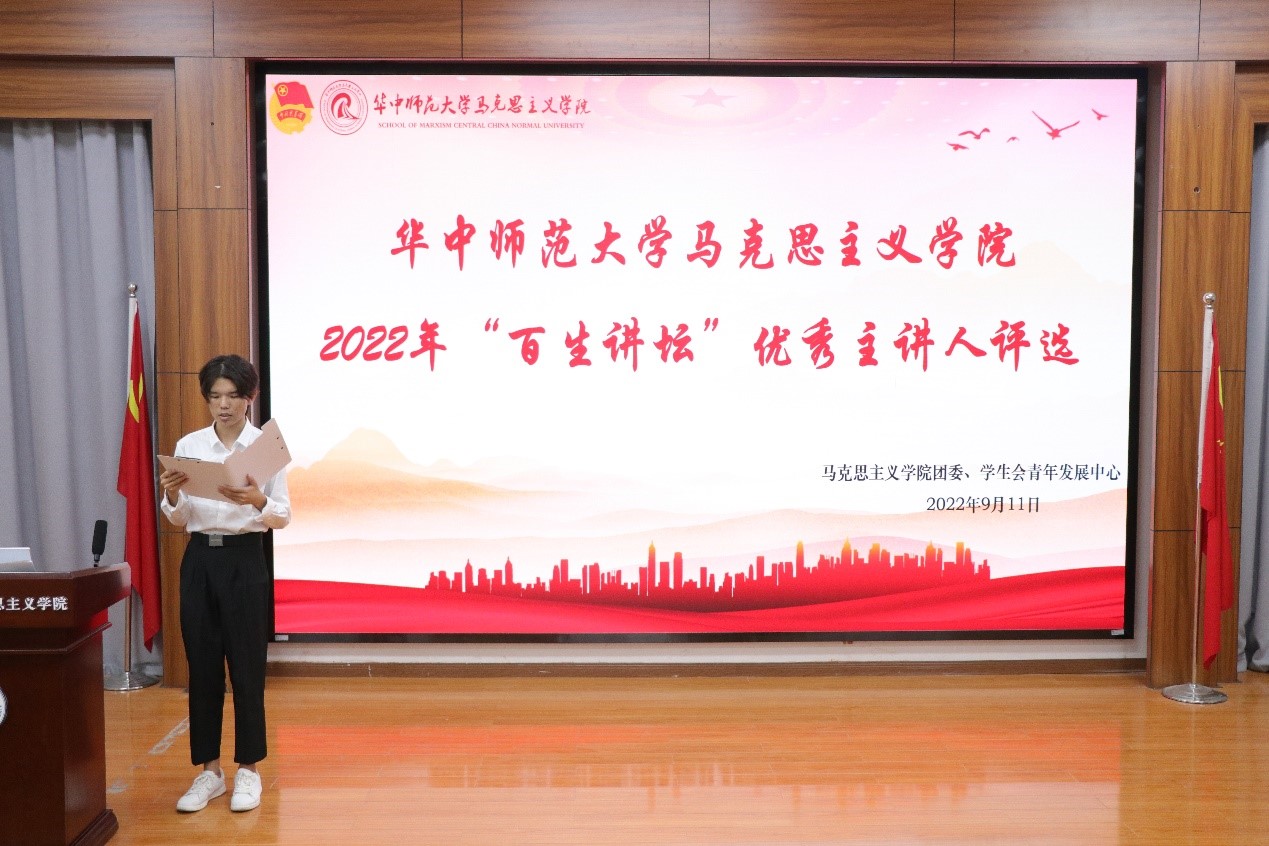 马克思主义学院讯(通讯员 黄天锡;摄影 黄楚宇 石浩冉)9月11日下午,华中师范大学马克思主义学院“百生讲坛”优秀主讲人评比活动在一号楼1101教室举行。湖北省2021年度“百生讲坛”微团课银牌获得者刘梦觉、马克思主义学院团委书记赵芸逸、研究生2022级辅导员程玉璐出席活动并担任评委。青年发展中心韦昊宇主持本次活动。