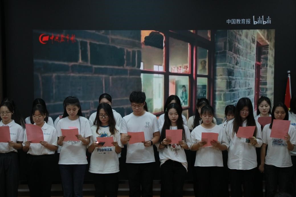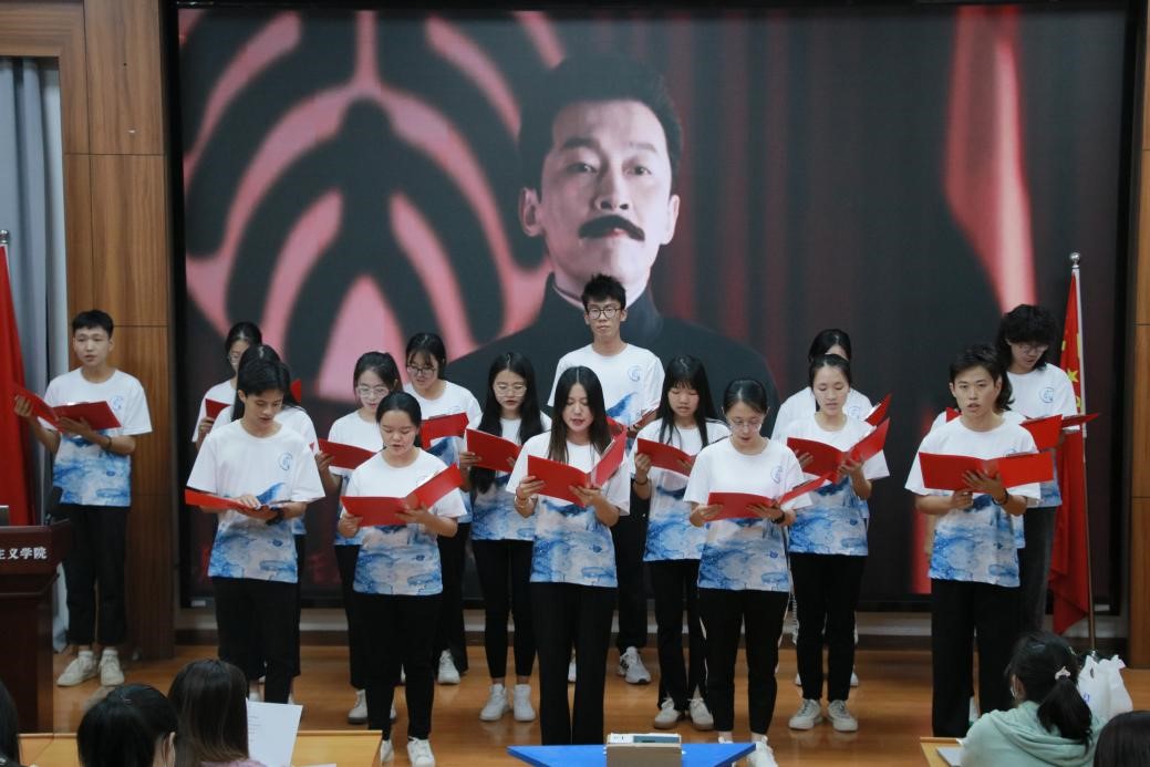 马院2020级和2021级师范生集体在表演中充分展现了青春昂扬的班级风貌,呈现了当代师范生的青春姿态。2002班将朗诵与合唱《光阴的故事》相结合,铿锵的朗诵和朗朗的歌声展现了班集体积极向上的精神风貌。2102班齐声朗诵《写给未来的你》,并将写给未来自己的信投入时空信箱,传递了对先辈的敬意与怀念、对未来的期待与盼望。