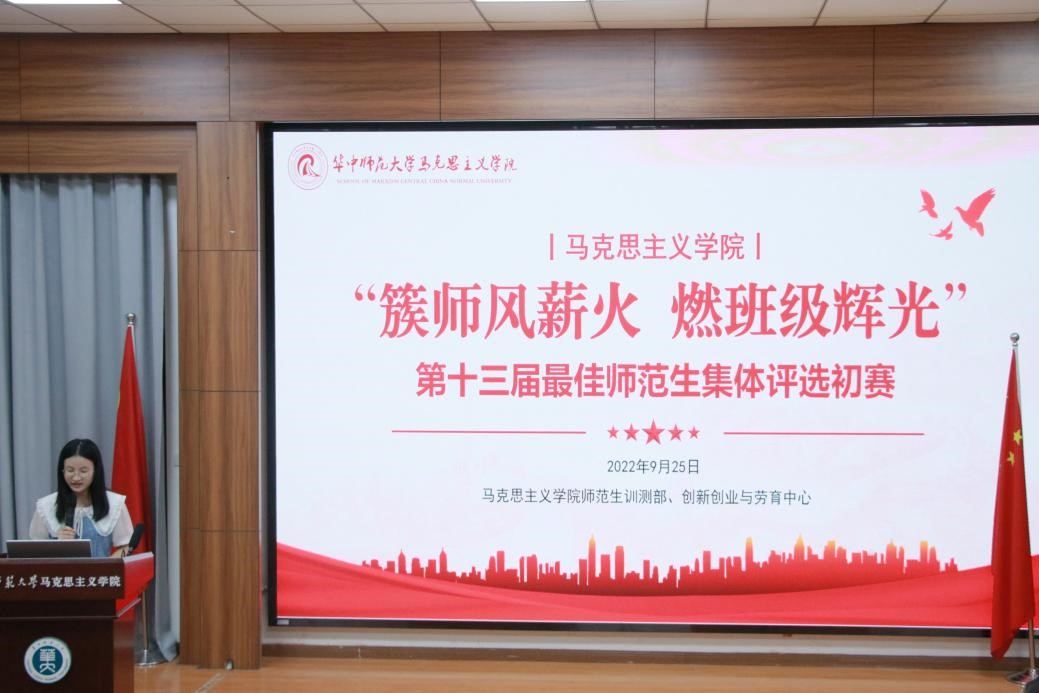 马克思主义学院讯(通讯员 黄楚宇;摄影 黄天锡)9月25日,华中师范大学马克思主义学院第十三届最佳师范生集体评选初赛在1号楼1101教室举行。2022级本科生辅导员田聪娇,学生团委副书记项文慧、史可佳、吴宇凡出席本次活动并担任评委。活动由师范生训测部负责人田桂菊主持。