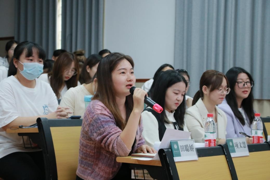 在点评环节,评委们分别从材料撰写与舞台展示两个方面指出各个师范生集体的优点与不足。田聪娇赞扬了2002班和2102班朗诵与合唱相结合的表演形式,同时指出了朗诵的氛围和节奏有待改善和部分表演环节有待优化的问题。项文慧肯定了各班节目中展示出来的班级凝聚力和表演节目形式的创新性,同时对各班的文本材料提出相关建议,要求各班从细节入手,对材料的撰写要精益求精。