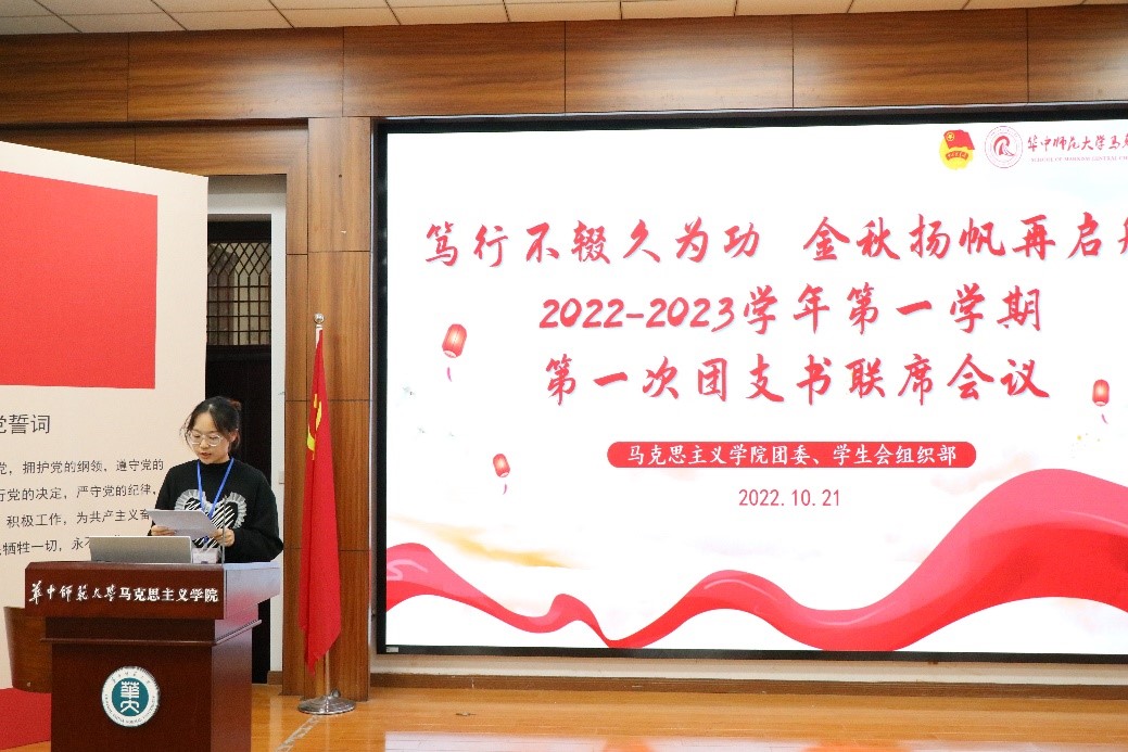 马克思主义学院讯(通讯员 邓潇潇;摄影 李文奕)10月21日中午,马克思主义学院“笃行不辍久为功,金秋扬帆再起航”2022-2023学年第一学期第一次团支书联席会议在一号楼1101教室举行。本次会议由马克思主义学院团委、学生会组织部主办,组织部全体成员和各团支部负责人出席本次会议,组织部负责人石梦洋担任本次会议主持人。