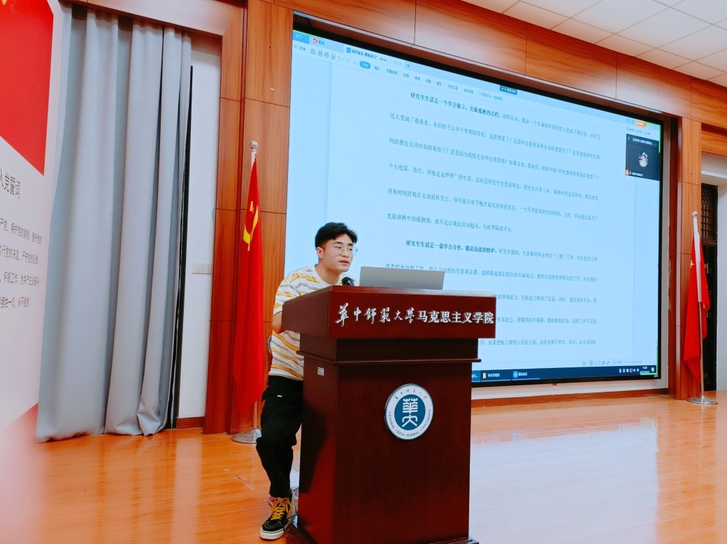 20级中共党史专业的吴昊学长则从他眼中的研究生生活和学习切入,风趣幽默又诚意满满,他告诉同学们在生活中既要学会独立、克服孤独,又要学会合作锻造技能;既要常常自律自省、补齐短板,也要静心沉淀、拒绝内耗;学习上则要找到兴趣、构建体系,多向导师请教、多和同伴交流、多关心时政、多大胆尝试,只要踔厉奋发、勇毅前行就一定能够到达胜利的终点。