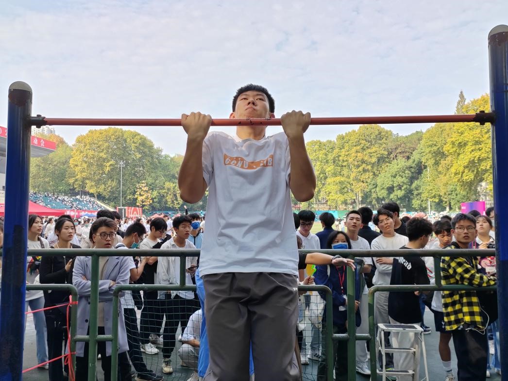 下午的男子组引体向上比赛在佑铭体育场南侧顺利进行。简单的热身后,比赛开始,马院选手一跃而上,攀上单杠,他们双手紧握横杆,用力推臂,撑起、落下,流利的动作彰显出他们的力量。在体力透支的情况下,他们仍旧咬牙坚持,比赛场外的志愿者们加油呐喊,他们没有丝毫懈怠,秉持着“不到最后一刻绝不放弃”的精神,继续突破自我、坚持到底,彰显马院学子奋勇拼搏的体育竞技精神!